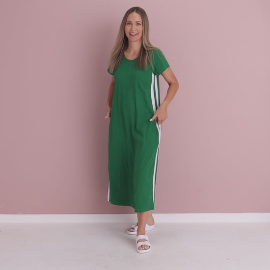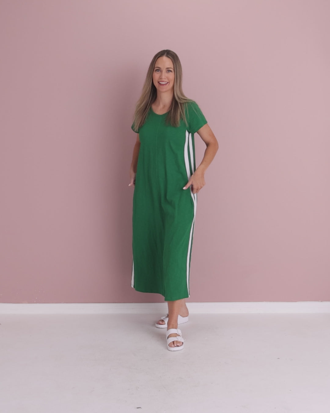 Breezy, comfortable and easy to throw on, the Recovery Cotton Tee Dress in green is made from pure cotton for breathable comfort on warm days. The relaxed silhouette skims without clinging, while the round neckline and short sleeves keep the look laid-back yet polished. Side taping detail adds a sporty touch, and the midi length makes it an effortless option for weekend errands, beach walks or travel. Pair with slides or sneakers for everyday ease.