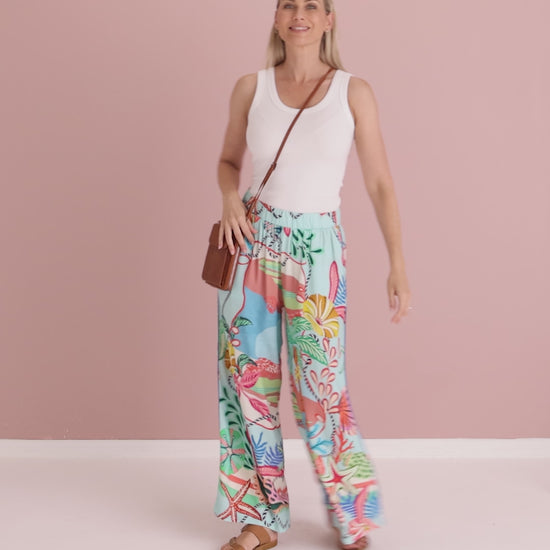 Bring a splash of sunshine to your wardrobe with the Rio Reef Pant in the Tropical Beach print by Betty Basics. The vibrant coastal pattern instantly lifts any outfit, while the soft drape woven fabric gives these pants their beautifully flowy, relaxed silhouette. The wide-leg cut moves effortlessly with you, and the elasticised waistband makes them an easy, all-day-comfort choice for warm-weather dressing. Finished with practical pockets and a breezy feel, they’re perfect for beach holidays, long lunches, travel days or simply adding colour to casual summer outfits. Pair with a simple tee or tank for effortless style.