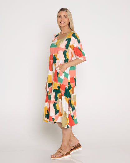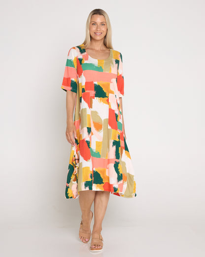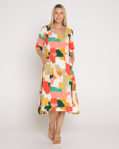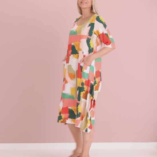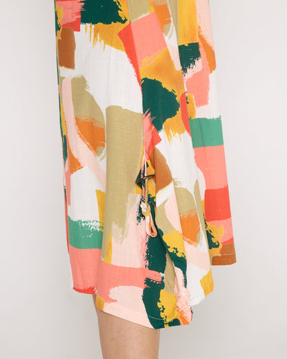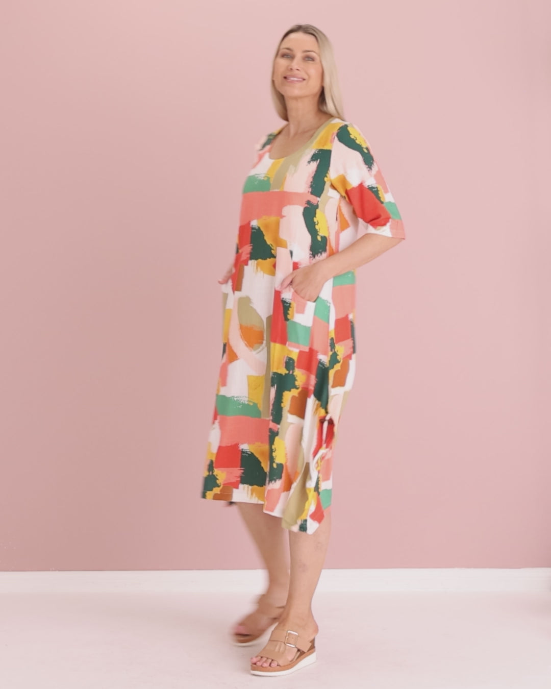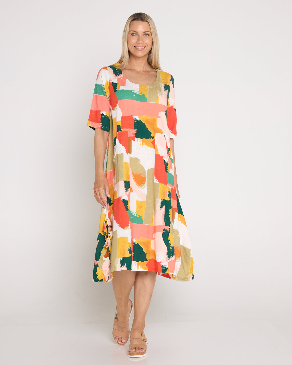 Embrace effortless elegance with our River Linen Dress now in a new abstract design with a medley of peachy, golden and green shades. This knee to midi-length dress boasts a scoop neck, cap sleeves, and convenient pockets. Embrace comfort and style with this ocean-inspired fashion statement.