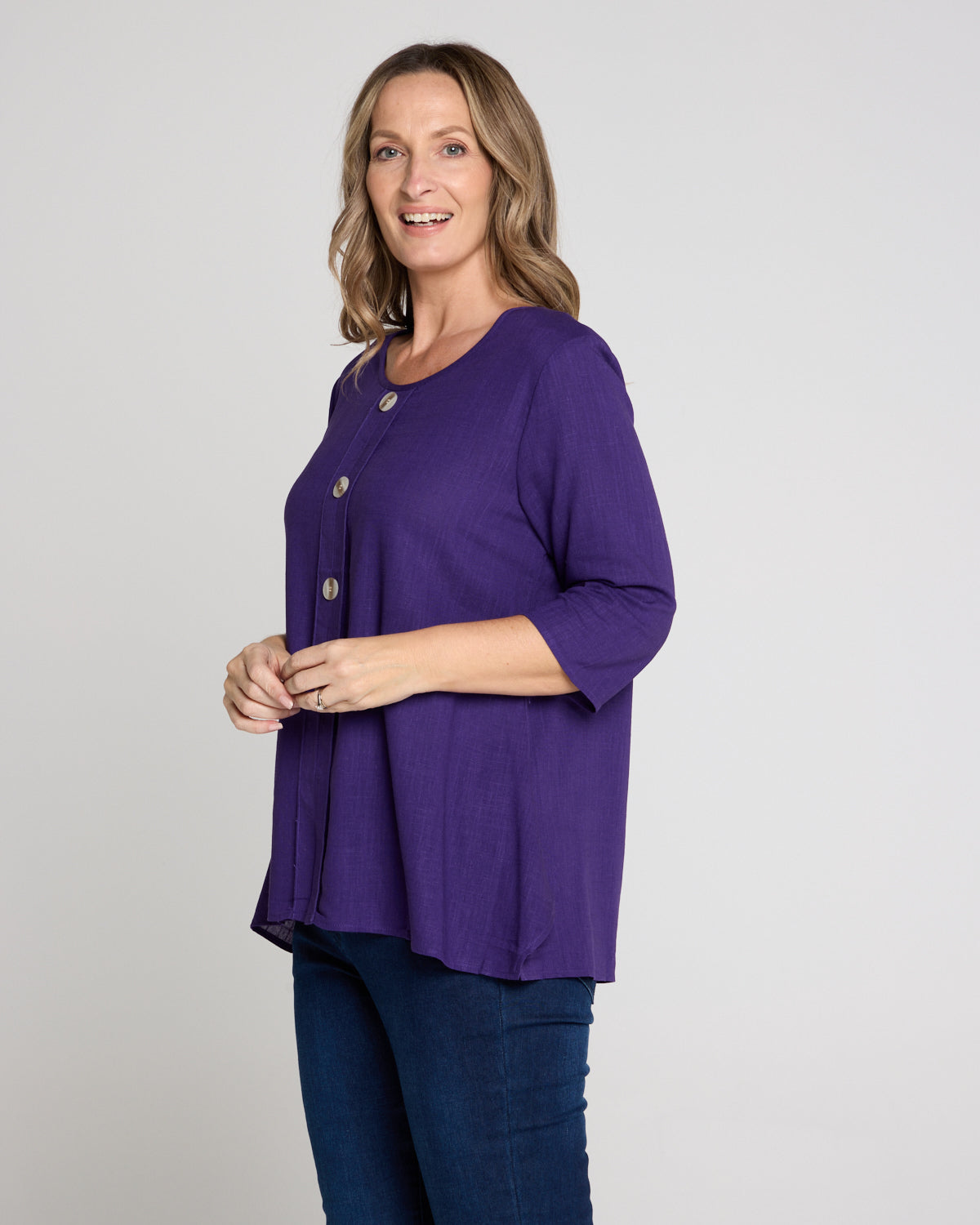 The Samira Top now comes in a beautiful purple shade. This design is the sister to the Sabrina Top, offering the same effortless style and everyday comfort in a linen and cotton blend. With its relaxed fit and flowy silhouette, this top is perfect for both casual and dressy occasions. The decorative button detail down the front adds a refined touch, while the breathable, lightweight fabric ensures all-day comfort. Whether paired with tailored pants or your favourite denim, the Samira Top is a versatile wardrobe staple that brings effortless sophistication to any look.
