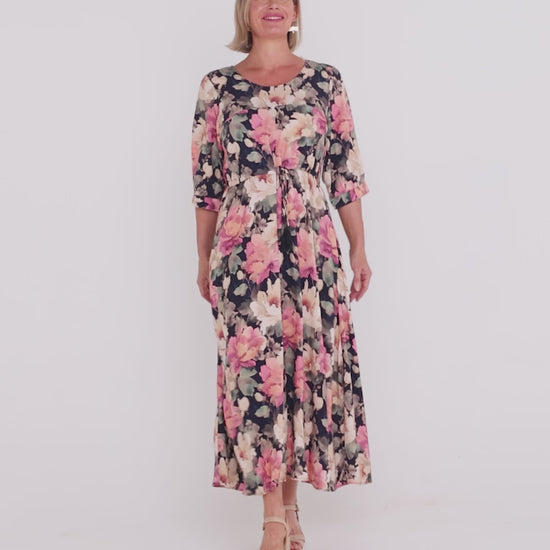 The Sara Dress in Autumn Floral is an effortlessly elegant style designed for easy, everyday wear. Featuring a soft floral print layered over a deep navy base, this maxi dress brings together warmth, femininity and versatility in one flattering silhouette. Crafted from a smooth woven rayon, it drapes beautifully through the body without clinging, creating gentle movement as you walk.