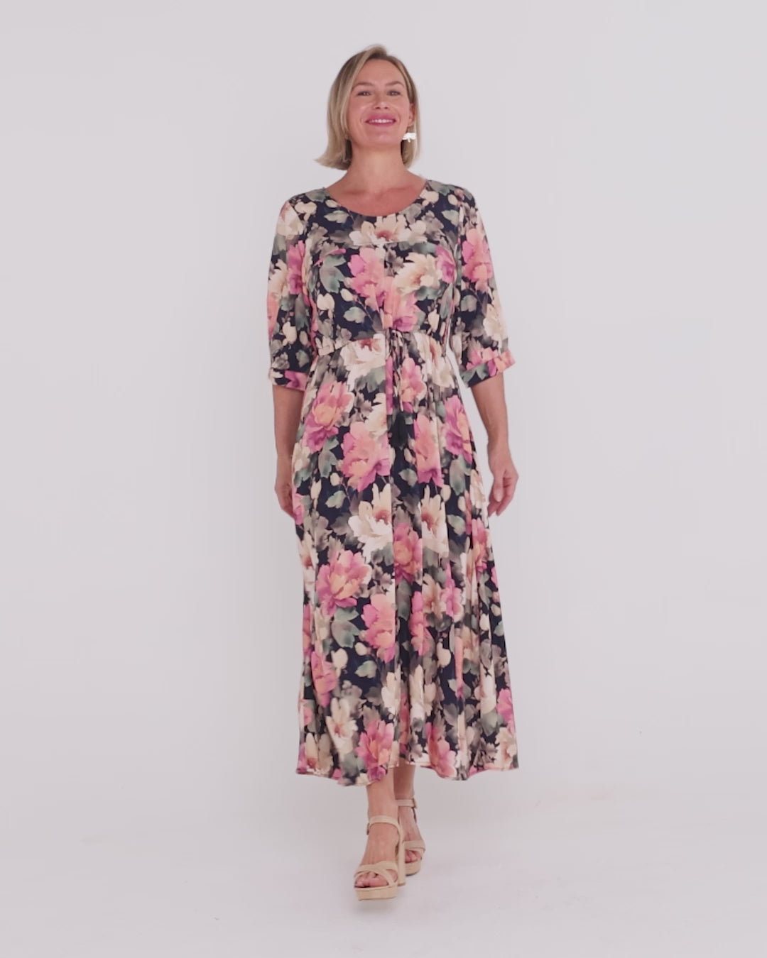 The round neckline and elbow-length sleeves offer comfortable coverage, while the adjustable drawstring waist allows you to softly define your shape or wear it loose for a relaxed feel. Finished with practical side pockets, this is the kind of dress you’ll reach for time and again. Style it with sandals for daytime, or dress it up with wedges and gold accessories for dinners, events or travel.
