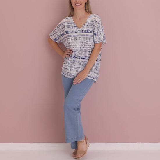 The Sasha Embroidered Top – Nautical Breeze brings an elevated artisanal touch to your everyday style. Crafted from a lightweight lyocell-nylon blend with a softly crinkled finish, it’s enriched with intricate contrast embroidery that adds texture, detail and a handcrafted feel. The relaxed silhouette ensures drape and comfort, while the V-neckline and extended sleeves make it an effortless throw-on style for warm weather. Pair it with white pants or denim for a polished yet easy-going look.