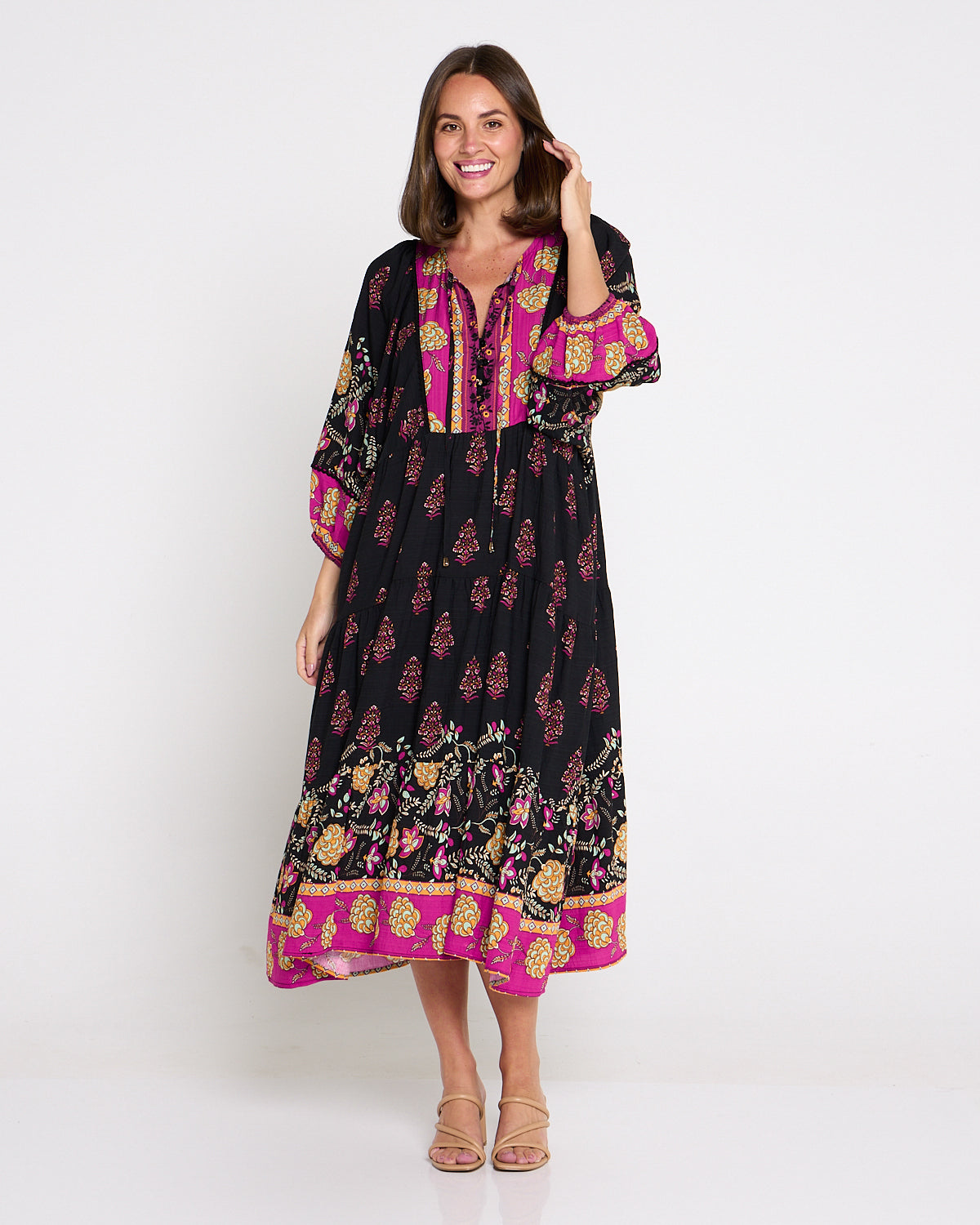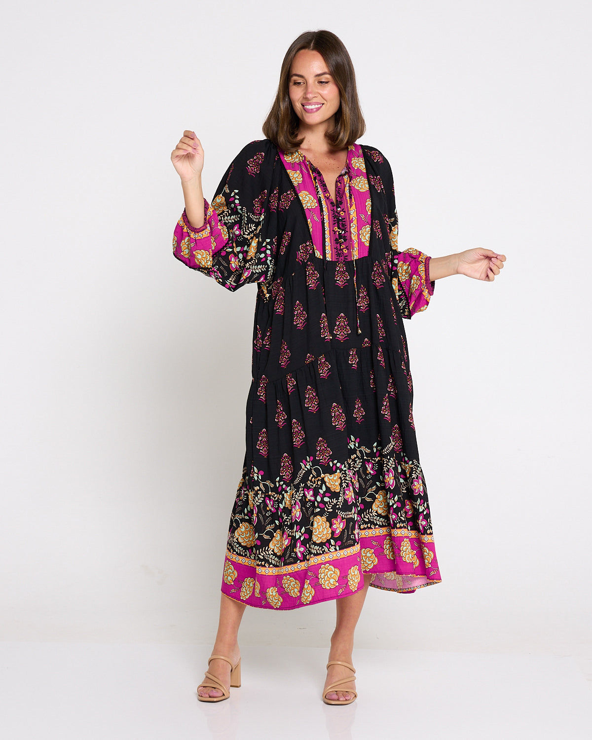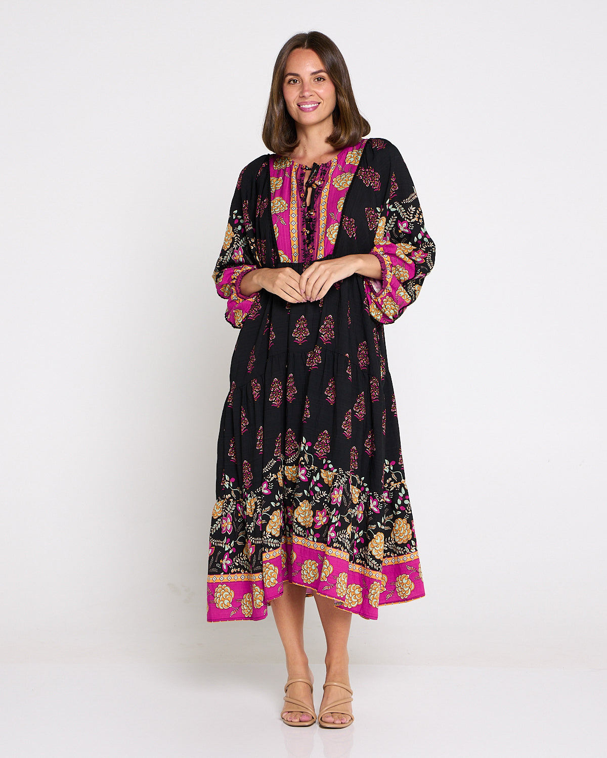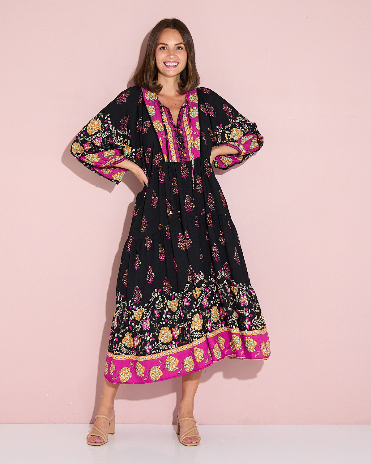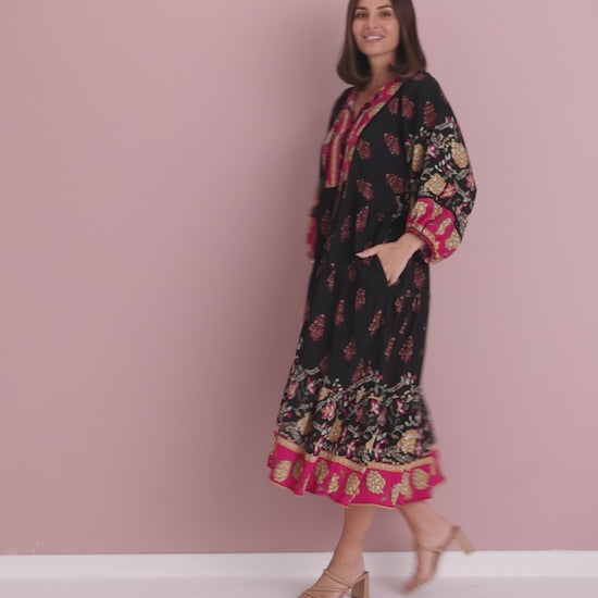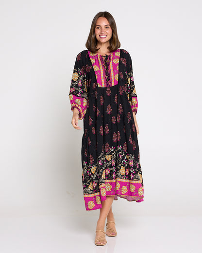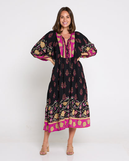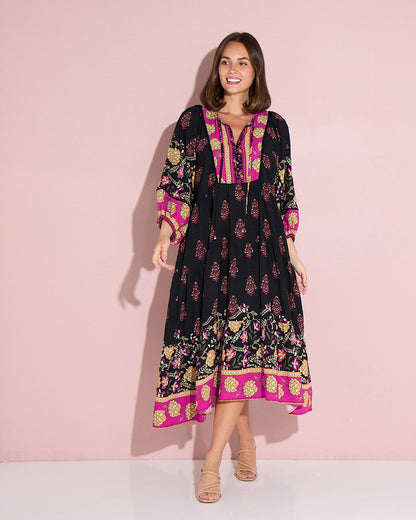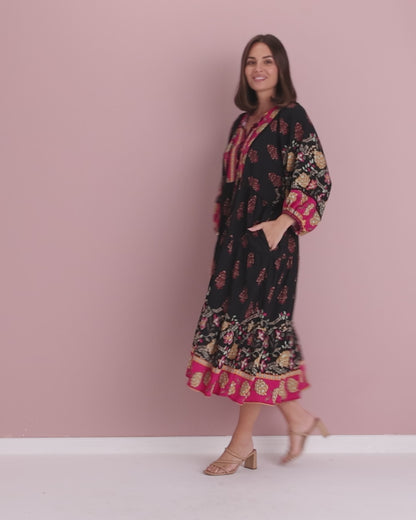 A statement maxi-midi with effortless romance, the Seraphina Dress by BOHO blends rich black with pops of fuchsia and gold for a bohemian flourish. The soft, draping weave floats over the body without cling, while billowing sleeves and a tiered hem add beautiful movement. A tie front lets you wear the neckline closed or open into a V for a lengthening effect, and on-seam pockets keep it practical. Style with tan heels for dinners, or sandals and a tote for market mornings.