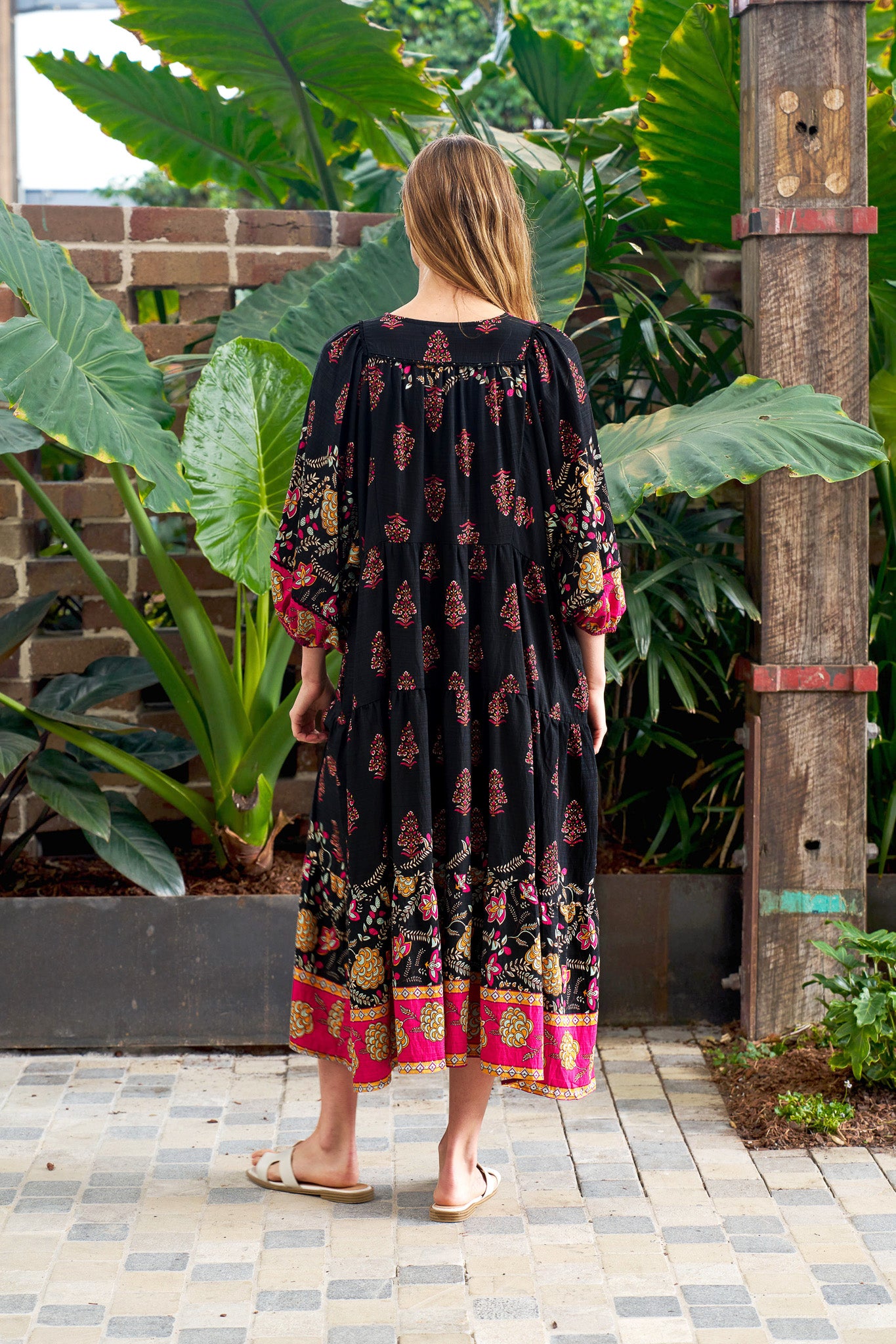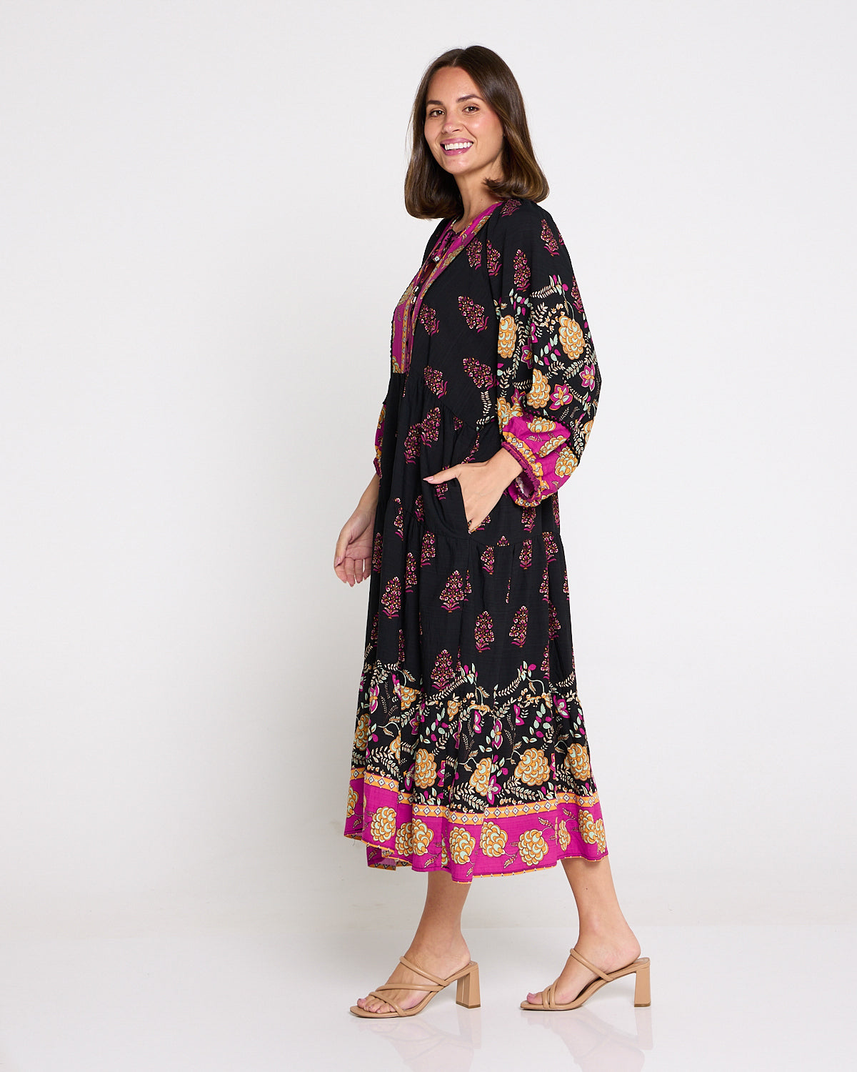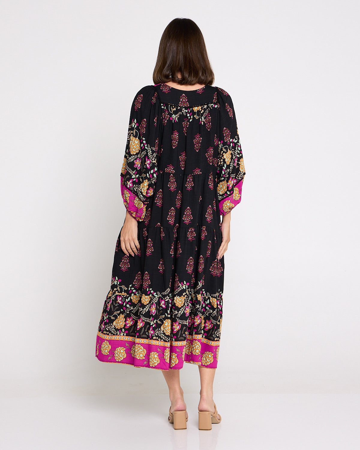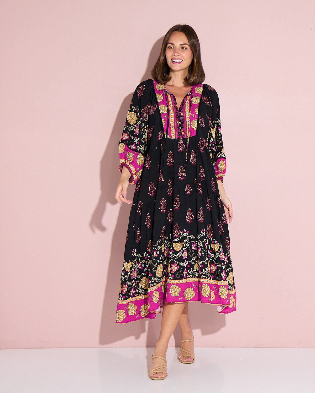A statement maxi-midi with effortless romance, the Seraphina Dress by BOHO blends rich black with pops of fuchsia and gold for a bohemian flourish. The soft, draping weave floats over the body without cling, while billowing sleeves and a tiered hem add beautiful movement. A tie front lets you wear the neckline closed or open into a V for a lengthening effect, and on-seam pockets keep it practical. Style with tan heels for dinners, or sandals and a tote for market mornings.