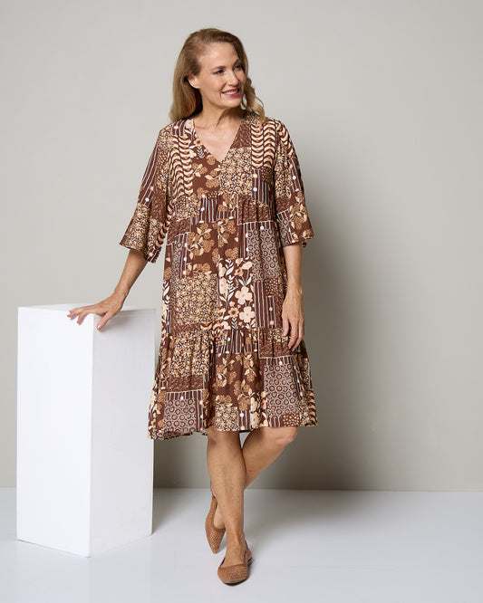 The size chart says bust for size 20 is 124-130cms. I disagree. Laid flat from armpit to armpit on mine is 60cms = 120cms. I hand washed inside out in cold water with mild detergent, did not soak or wring out, hung on a hanger to drip dry in shade & it did not shrink. I give a cool light iron and it is ready to go. I think you could probably get away without an iron but I prefer wearing after a light iron to relax the fabric and smooth out the wrinkles, albeit not many. The fabric is so lovely, light & cool to wear. The other day when I wore it, the weather was warm and humid (not Darwin or QLD humid) but after a very cold winter, & Spring not having really sprung properly yet in ADL/ weird & different weather every day, & not being used to warm weather yet, the dress did not stick to me. The pattern is so pretty. It sits really nicely under my bust, flows over & does not cling to my tummy & does not look frumpy, so I feel more confident. It is very comfortable across my bust & does not feel tight which is often the problem for me. The sleeves are a great length and hide my chubby upper arms that I don't like to reveal. I love the length too. I am tall at about 178cms (I think!!) & it is below my knee which I also feel more confident with. I have issues sometimes with dress waist ties being too low and just not working for me & quite frankly look weird & ridiculous sitting on my hips. My preference is a higher waist tie not too far under the bust to get a good A-line shape. WIth this dress the position of the seam of the bodice where it meets the skirt is good for me - higher than my hips giving a good shape. The skirt with the godets is just lovely giving it some body and floats about nicely. I thought I might be too big for this style but it actually works for me giving me some shape without being restricted with waist ties or elastic or shirring. For me the 20 is fitted but still roomy and so very comfortable. I am learning to try and not buy clothes that are WAY too big for me. I cannot hide the fact that I am big, but if I wear clothes that are not 2 sizes too big it is more flattering!! Tulio are also great to deal with and very responsive to emails and very helpful. Shipping was fast!! I hope this review helps some ladies out there. Thank you for reading :-)
