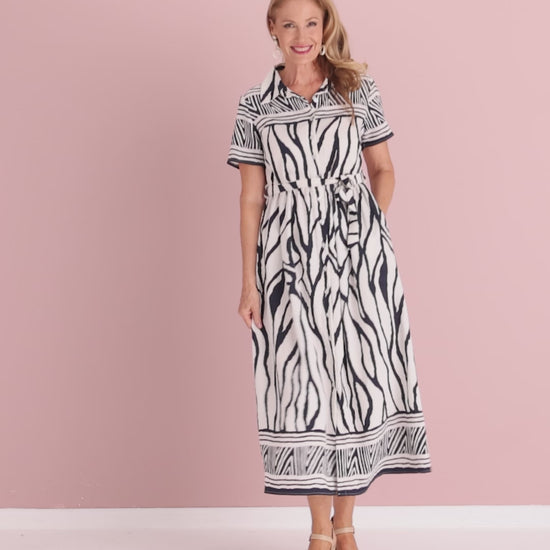 The Serengeti Shirt Dress in Navy brings relaxed elegance with a bold, nature-inspired twist. The flowing rayon-nylon blend drapes softly yet feels light and airy, ideal for warm Australian days. The striking navy-and-ivory print adds effortless impact, while the button-through front and gentle gathering at the waist create a flattering, easy silhouette. Short sleeves offer comfortable coverage, and the optional matching belt lets you switch between a relaxed fit or a more defined waist. Finished with a sweeping maxi length and side pockets, it’s the perfect β€œthrow on and feel amazing” dress for holidays, long lunches, weekend markets or everyday style.