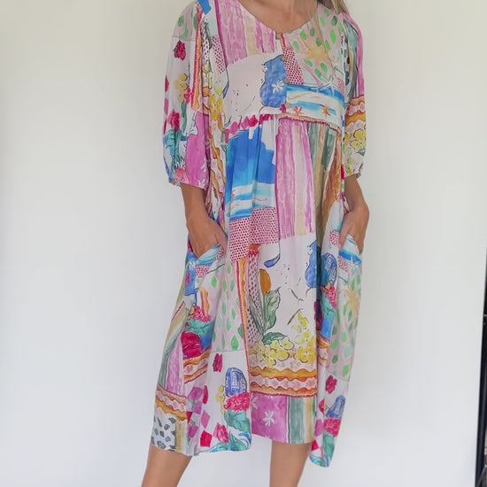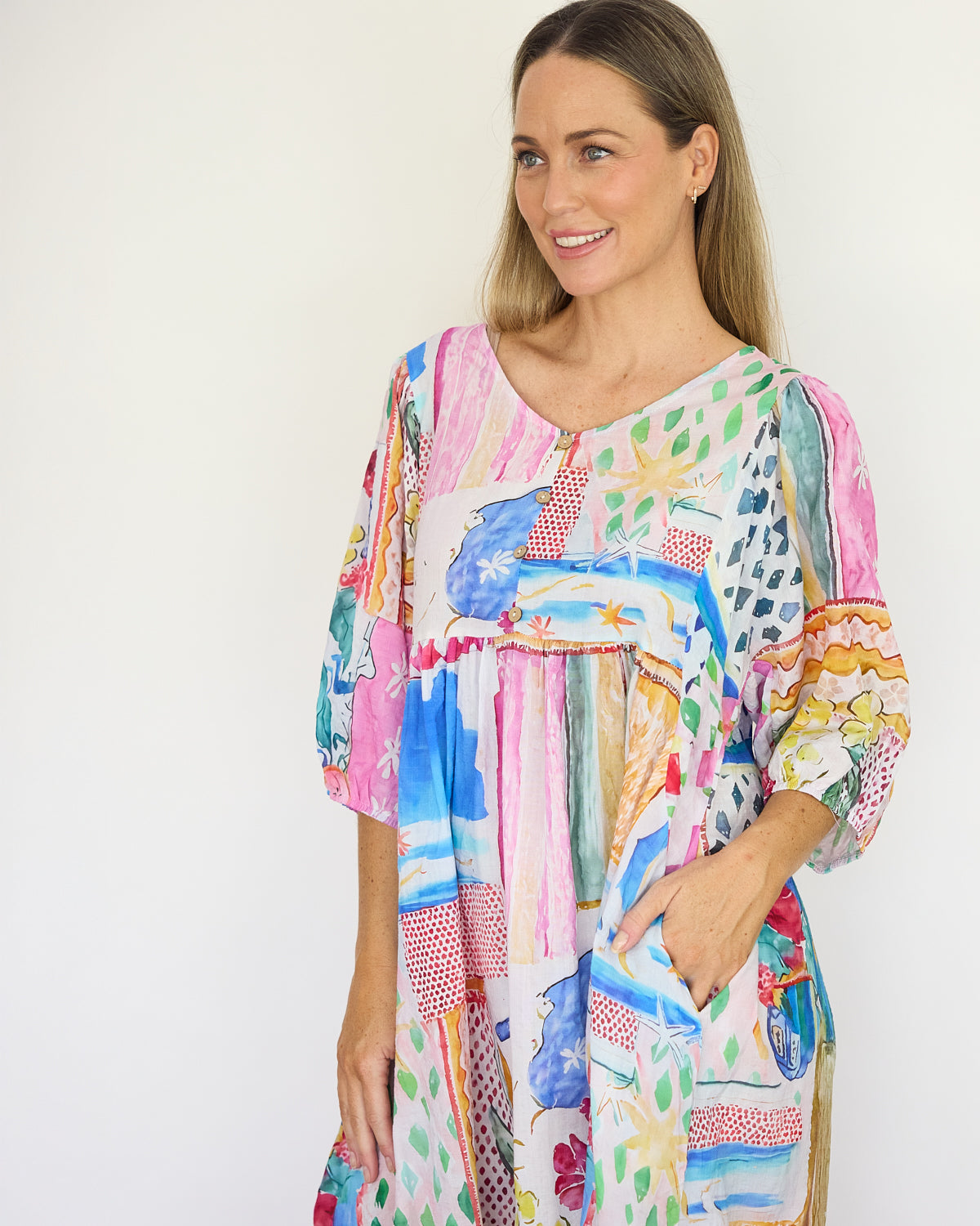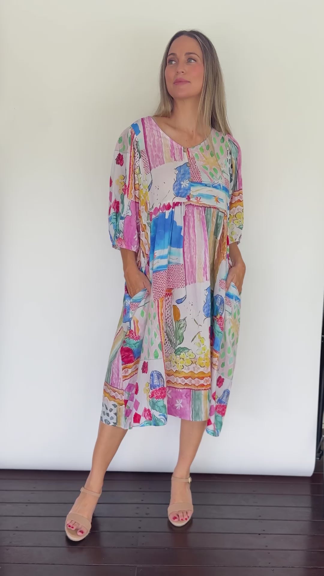Fresh, artistic and effortlessly wearable, the Shannon Cotton Dress in Coastal Watercolour is a beautiful statement piece for warm-weather dressing. Crafted from pure cotton, it feels naturally cool and comfortable, making it ideal for sunny Australian days. The soft white base is brought to life with a painterly mix of coastal-inspired blues, pinks, greens and soft citrus tones, giving the print a relaxed, hand-painted feel. Designed with a flattering V neckline and decorative buttons over the bust, this midi dress features gentle gathering through the shoulders for added shape, while the relaxed silhouette offers easy, all-day comfort. Finished with half-length sleeves, elasticated cuffs and practical in-seam pockets, it’s a lovely choice for holidays, lunches, casual events or everyday wear. Style with slides or wedges for an easy polished look.