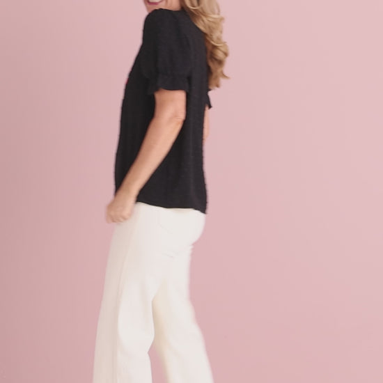 Fresh, feminine and beautifully detailed, the Sierra Top in Folk Floral Black brings a refined folk-inspired feel to everyday dressing. Set against a classic black base, the vibrant embroidered floral detail through the neckline really pops, adding colour and interest without feeling overdone. The relaxed silhouette skims the body comfortably, while the subtle dobby texture through the fabric gives it an elevated, tactile finish. Short puff sleeves with elasticated cuffs add gentle shape through the shoulders and arms, balancing softness with polish. Easy to style with light denim, linen pants or tailored neutrals, this is a versatile top that works beautifully from daytime outings to casual lunches.