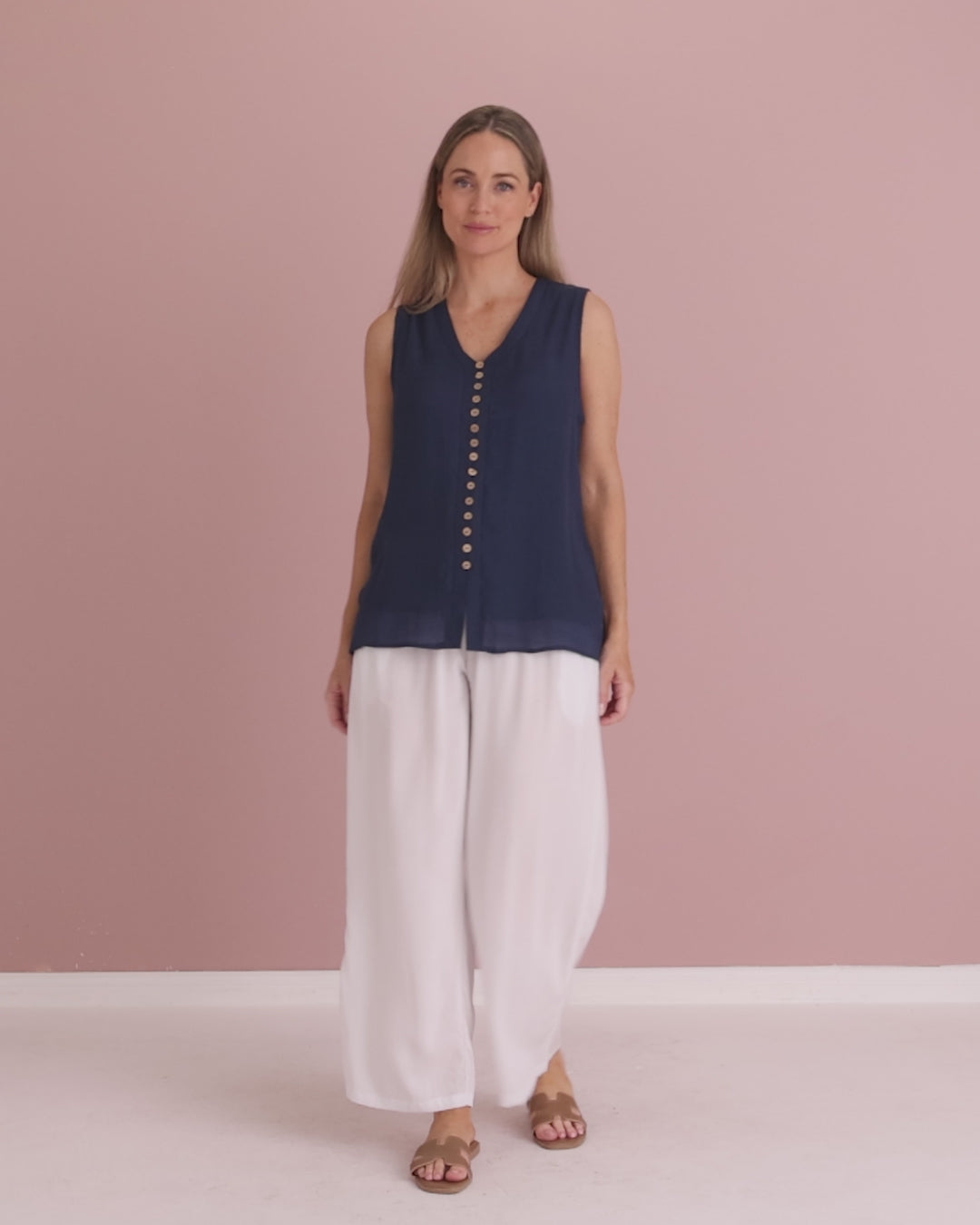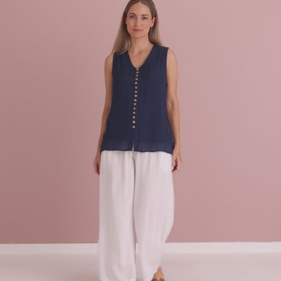 The Navy Gemma Top is here in a stunning sleeveless silhouette, and it's the ultimate wardrobe essential for effortless elegance. This relaxed design delivers understated sophistication with its textured woven fabric that feels as luxurious as it looks. Coconut shell buttons bring a subtle, handcrafted boho charm, while the flattering V-neckline and tank sleeves create a beautifully balanced shape. Double-layered construction adds depth and structure, and the non-stretch fabric ensures a polished, intentional fit. Perfect for layering or wearing solo, this piece transitions seamlessly from day to night.