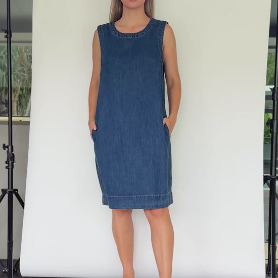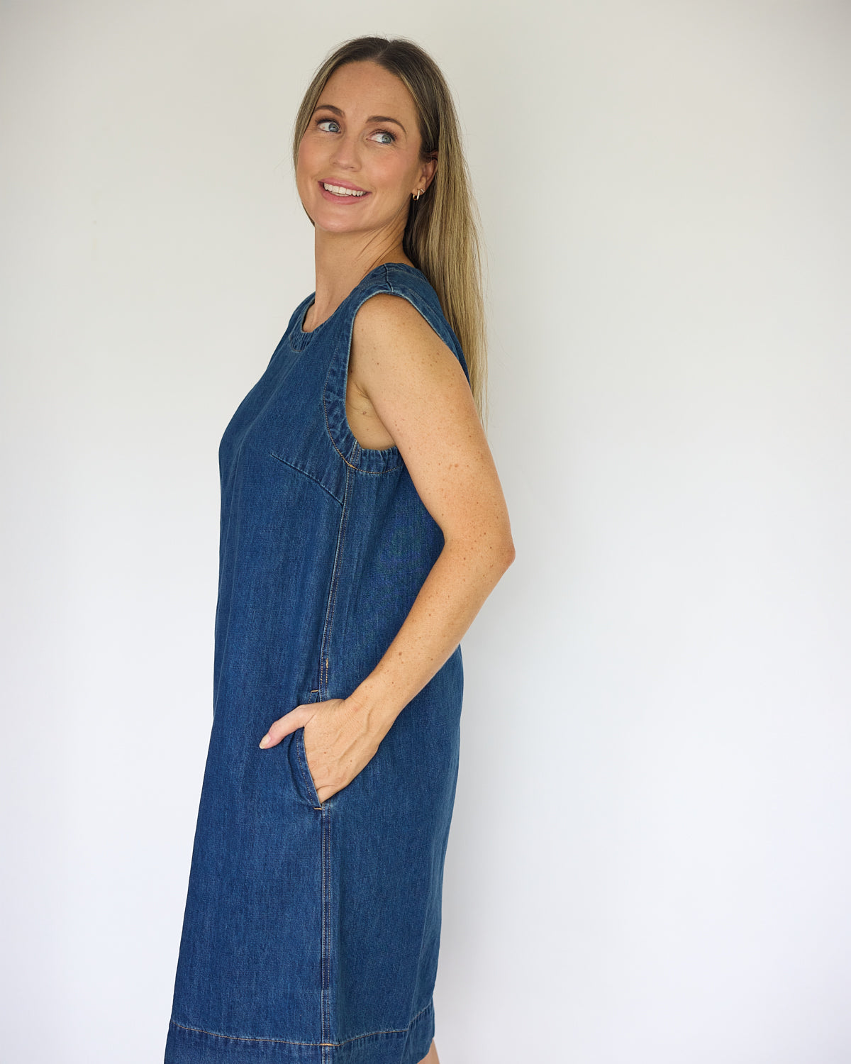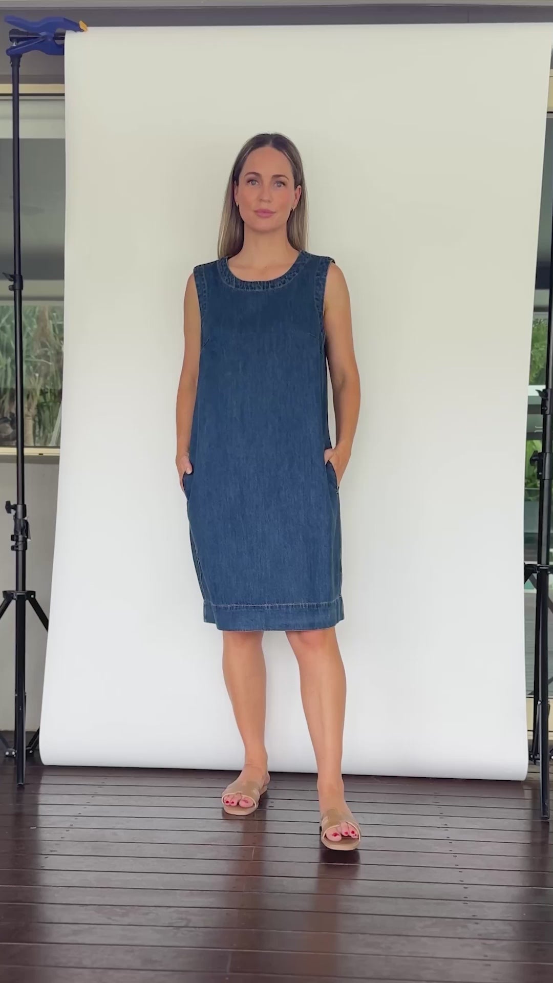 Designed in a relaxed A-line silhouette, the Sonny skims the body without clinging, offering a flattering fit through the shoulders and hips. The sleeveless cut keeps it cool and easy to layer, while side seam pockets add practicality. A subtle split at the back neckline with a button opening provides a thoughtful finishing touch. Style it with slides or sneakers for daytime, or add wedges and statement jewellery for an effortless, polished look.