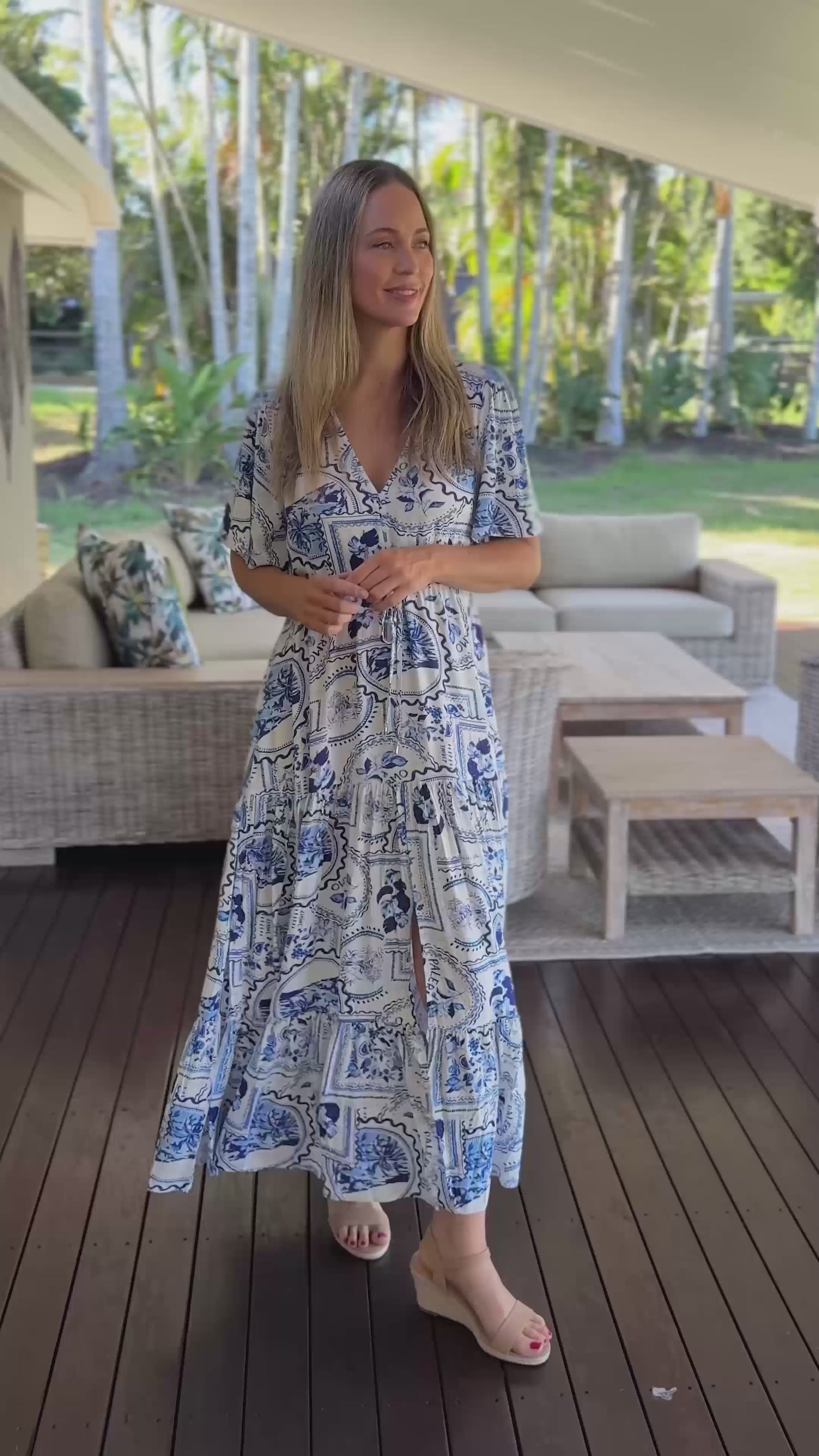 Designed to flatter, the Soraya features a soft V neckline with functional buttons through the bust, balanced by short flutter sleeves for light, feminine coverage. The adjustable drawstring waist allows you to shape the fit to suit your body, while the tiered skirt adds movement and flow with every step. Finished with a subtle front split and practical side pockets, this style transitions seamlessly from daytime events to relaxed evenings. Style with wedges for lunches and celebrations, or keep it casual with flats for holidays and weekends.