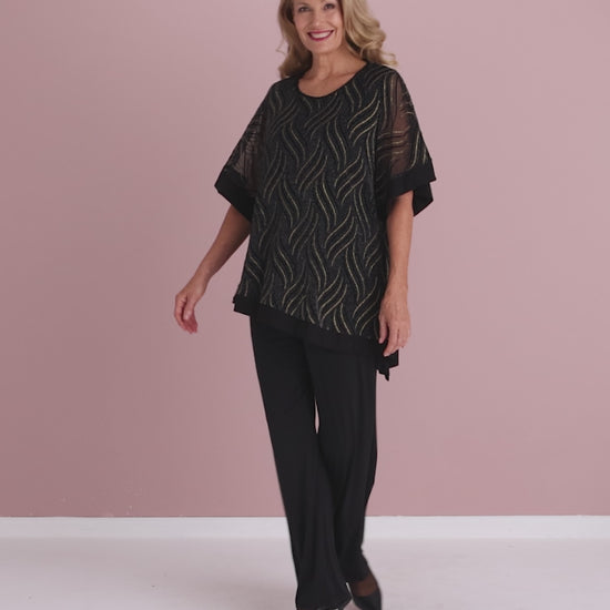 Make every outing feel special with the Sparkle Cape Top. A sheer black mesh is scattered with glittering metallic threads and soft black flocked waves that catch the light beautifully without feeling over the top. The relaxed cape overlay drapes gracefully over a smooth jersey underlayer for confident coverage through the body and arms. Finished with solid black trims for a polished edge, it pairs effortlessly with dress pants or a simple skirt for dinners, parties and festive occasions. Easy to wear, easy to pack and made for women who like comfort with a touch of glamour.