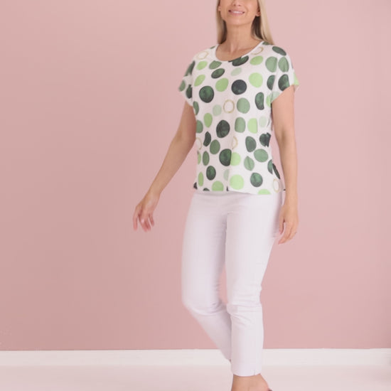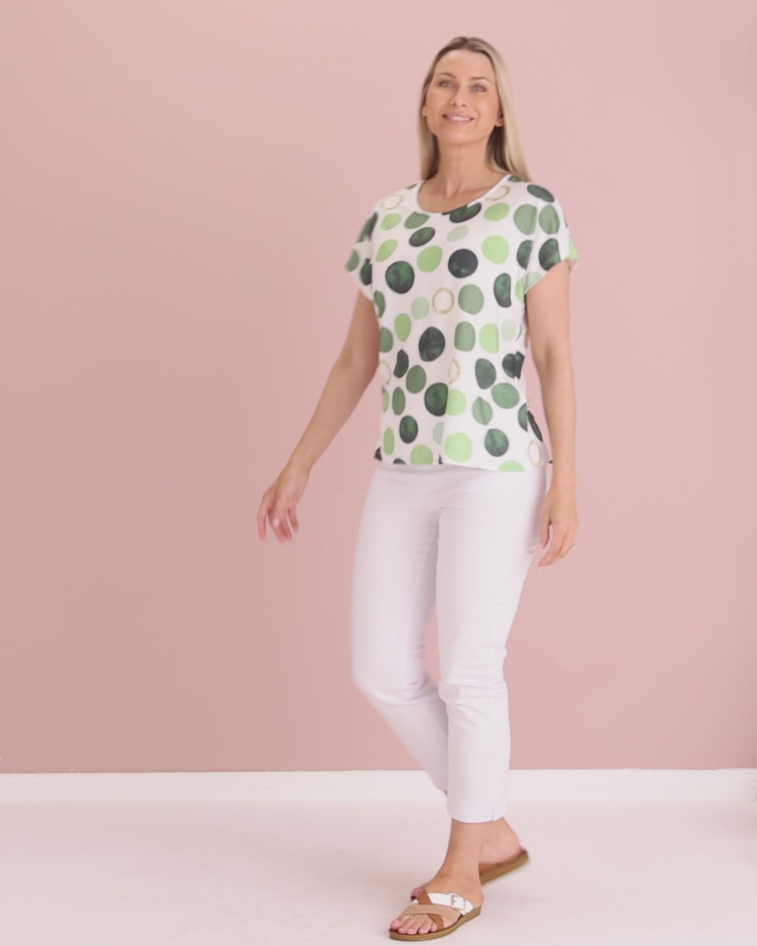 Fresh, fun and effortless, the Spotty Dotty Top adds a lively pop of green to your everyday wardrobe. The soft stretch jersey skims the body without clinging, while the playful spot print lifts simple outfits in seconds. Easy to style with denim, white pants or a swishy skirt, it’s a reliable go-to for coffee runs, casual Fridays and weekends away. The easy-care fabric washes and dries quickly, making it a brilliant travel piece for warm Aussie days.