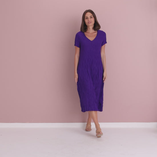 The Stella Dress in Purple proves why this style is a TULIO favourite. The crinkle stretch jersey needs no ironing—just wash, twist and wear—making it brilliant for travel and busy days. A gently shaped V neck, soft cap sleeves and the signature A-line silhouette skim the body without clinging, while hidden pockets add everyday ease. The rich purple hue lifts your look with minimal effort—pair with slides now and a light jacket when the breeze rolls in.