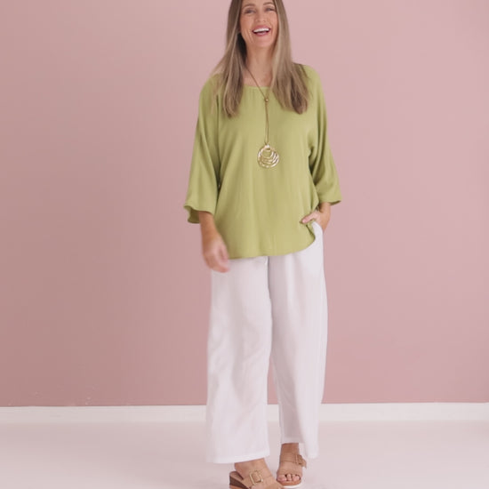 The Summer Ease Top has arrived in lime, perfect for warm weather style. The relaxed fit provides a comfortable, easy-going style, ideal for casual days or laid-back outings. Pair it with light trousers or jeans for a breezy, effortless look that radiates fun and energy.
