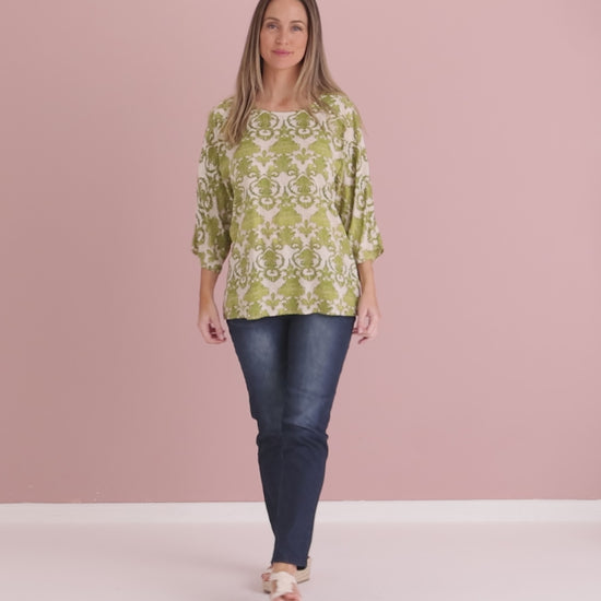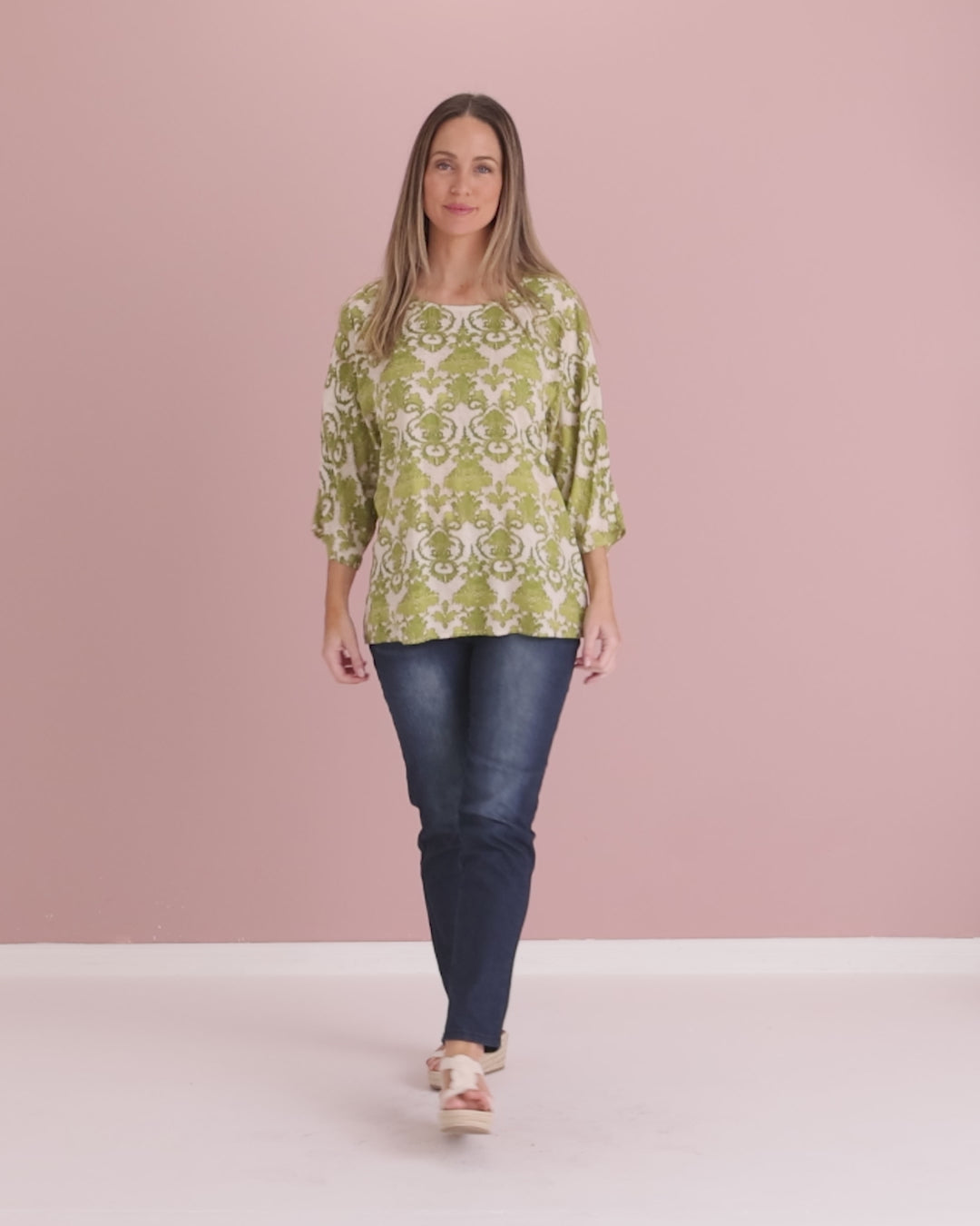 Breathe fresh energy into everyday dressing with this beautifully patterned take on our easy Summer Ease silhouette. The lime tapestry motif pops against a soft natural base, while the round neckline and extended 3/4 sleeves skim smoothly for relaxed coverage. Cut from lightweight woven rayon, it drapes without cling and feels cool on warm days. Pair with white crops or denim for brunch, markets or travel, and add neutral slides and a crossbody bag for effortless polish.