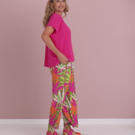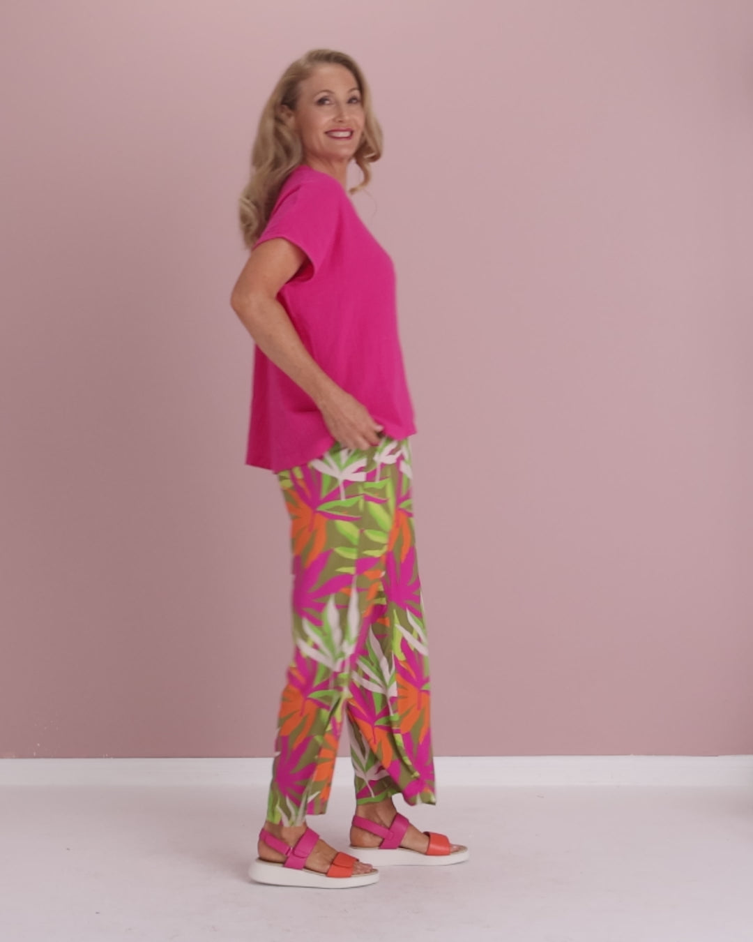 Step into summer with the statement-making Summer Rainbow Pants in the bold Tropical print. These breezy rayon pants feature a comfortable elasticised waistband, practical pockets, and wide legs with side splits for easy movement. Whether you pair them with the coordinating Solana Top for a matching set or keep it casual with a simple tee or cami, they offer vibrant style and comfort. Ideal for holidays, long lunches, or any sunny-day outing.