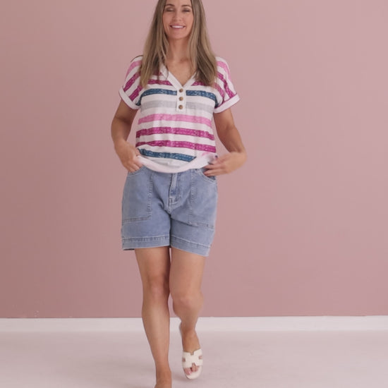 There's nothing like a t-shirt for easy spring and summer style. The Summer Sailor Tee has a fun twist, with a statement neckline and stripes on the white background in alternating shades of pink, magenta, deep teal blue and light grey. The soft stretch jersey is easy fitting and wrinkle resistant. Ideal for weekends on throwing in your suitcase when you're off on your next holiday.