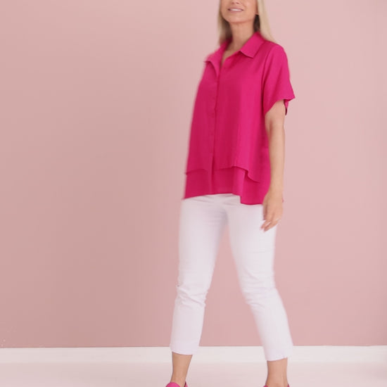 Bring a pop of joy to everyday outfits with the Tabitha Layered Shirt. In vibrant hot pink, this easy, floaty style offers polish without feeling fussy. The collared neckline and button-through front give it a neat, shirted look, while the softly flared, double-layer hem skims the tummy and hips for a flattering finish. Cut from a lightweight linen-rayon blend with a gentle drape, it’s lovely for warm days and travel. Style with white denim, linen pants or a slim skirt and sandals for lunches, casual Fridays or weekend outings.