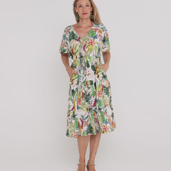 Bursting with colour and carefree movement, the Tamblyn Dress in Frangipani Tropical is a joyful warm-weather staple with a flattering, petite-friendly shape. This vibrant print blends lush greens with frangipani florals in soft yellows, peaches and warm pinks, creating a fresh tropical feel that’s eye-catching yet easy to wear. Crafted from soft, lightweight rayon, the fabric drapes beautifully and moves effortlessly with you, making it ideal for hot days and travel. Flutter sleeves add gentle coverage through the arms, while the adjustable waist tie allows you to shape the fit to suit your body without feeling restrictive. Finished with a tiered skirt for added flow, this is a feel-good dress perfect for brunches, holidays, garden parties or simply enjoying sunny days in style.