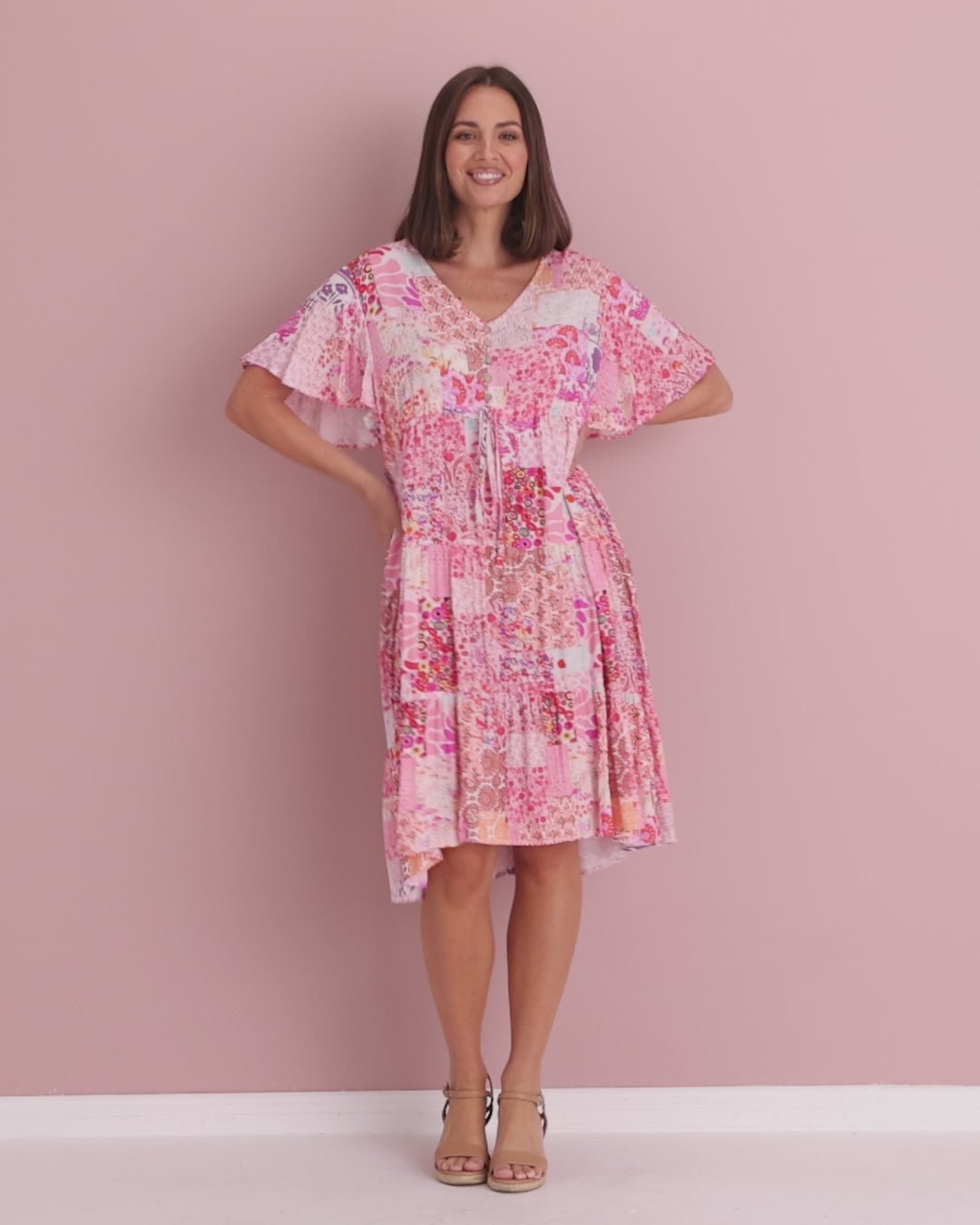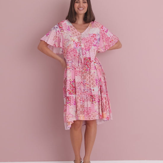 A joyful burst of colour for sunny days, the Tamblyn Dress floats beautifully in cool, breathable pure rayon. The patchwork floral print blends fuchsia, blush and lilac tones that lift the complexion, while the V neckline and flutter sleeves feel light and feminine. A softly gathered waist creates gentle shape without clinging, and yes—there are pockets. Slip on wedges for lunch by the water, swap to slides and a denim jacket for everyday errands or holiday wandering.