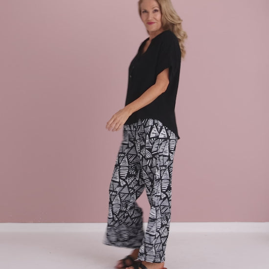 The Tammy Wide Leg Jersey Pants, a counterpart to the beloved Aiko Pants, showcase the same flattering silhouette with a full-length cut. Crafted from stretch jersey fabric, they provide effortless comfort and natural wrinkle resistance for low-maintenance wear. Featuring a distinctive black and white urban etch pattern, these pants bring a contemporary edge that effortlessly enhances the appeal of any simple top.