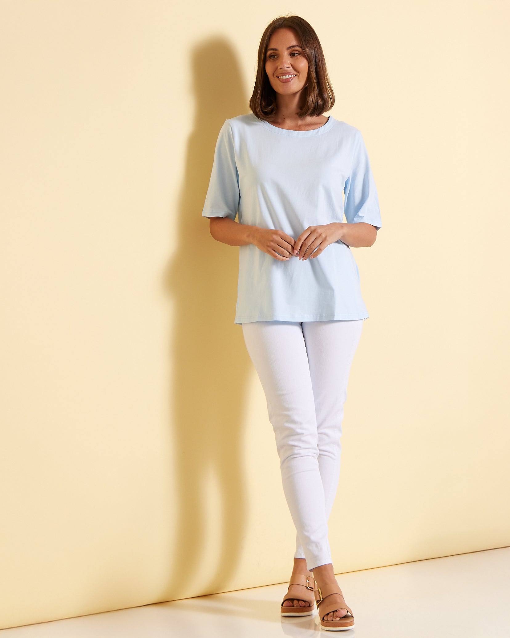 We simply had to have the TULIO Essential Tee in soft pale blue, one of our all time favourite colours. There's nothing more essential to a wardrobe than a comfortable t-shirt that fits just right. We love the simple cut of this one, with sleeves that offer a bit extra coverage on the upper arm. With a cotton rich composition with a touch of added stretch for an easy fit and to keep its shape, you just can't go wrong. Fans of The Ultimate Tee will also love the shape of this one, which shares the same silhouette, minus the cuff on the sleeve for a more streamlined fit.