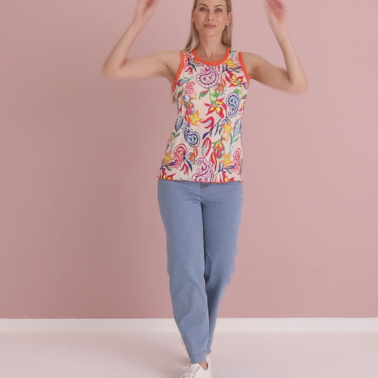 The Tijuana Tank Top in Dragonfruit Floral is a vibrant, easy-care essential for warm days. Cut from a soft stretch jersey, it feels smooth on the skin and moves comfortably with you. The bold, tropical-inspired print brings instant colour to any outfit, while the contrast binding adds a polished finish. With its sleeveless design and relaxed silhouette, this tank is perfect for layering under lightweight jackets or pairing with denim, white crops or wide-leg pants for fresh, effortless summer style. A great go-to for everyday wear, holidays and casual lunches.