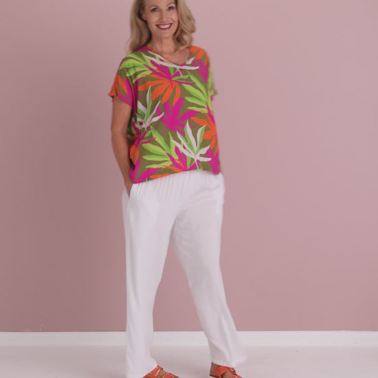 Bring a burst of holiday colour to every day with the Tina V Neck Top in Tropical. Splashed with vibrant pink, orange and lime leaves on a khaki base, it adds instant polish while keeping you cool. The relaxed, boxy cut skims without clinging, and the soft drape pairs beautifully with white pants or denim for brunch, travel or warm-weather gatherings. Dress it up with statement earrings and wedges, or keep it casual with slides and a straw tote.