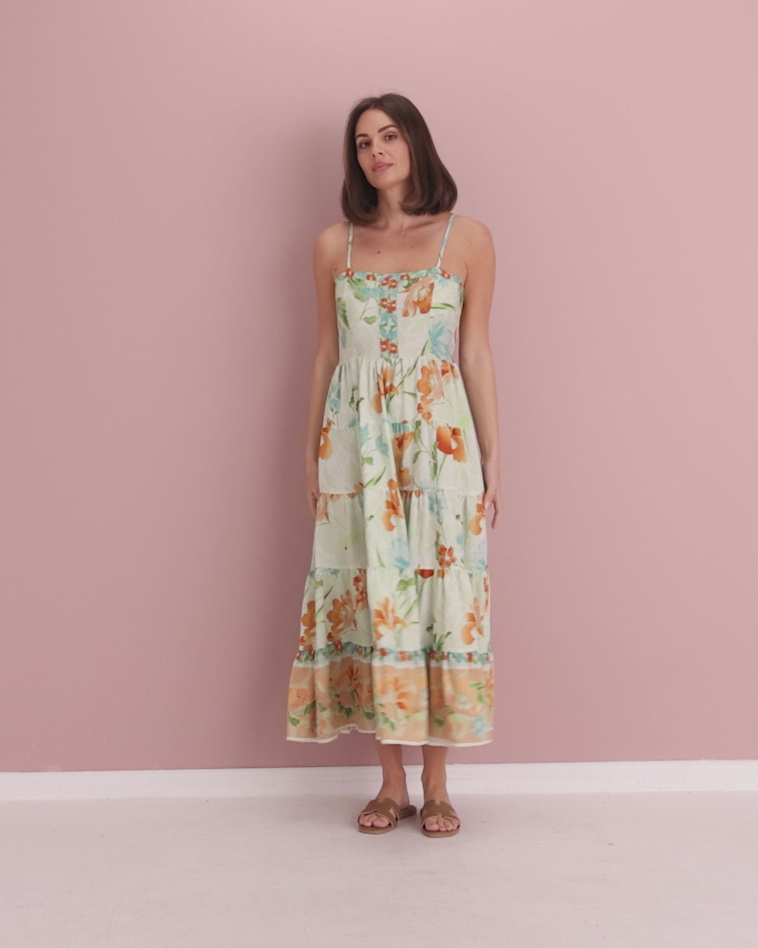 The Toliara Sleeveless Dress in Mint/Tan Floral is an effortless summer standout. Crafted from soft, breathable rayon, it drapes beautifully over the body with a relaxed tiered silhouette that moves as you do. The mint base and warm tan floral print give it a light, tropical feel, while the adjustable spaghetti straps and shirred back ensure comfort and an easy fit. A touch of lace trim along the tiered hem adds feminine charm. Perfect for warm days, holidays and relaxed lunches by the water — just add slides or wedges.