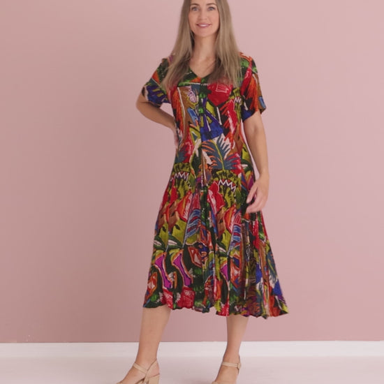 Make every sunny day feel special in Orientique's Godet Dress, now available in the show stopping Torque pattern. This vivid print comes to life on softly textured crinkle rayon crepe, skimming the figure before opening into a swishy, panelled skirt. The clever godet inserts add graceful movement and a flattering flare through the hem, while the V neckline and short sleeves keep the look effortlessly polished. Slip on wedges for lunches, add flats for everyday – it’s an easy, feel-good midi you’ll wear on repeat.