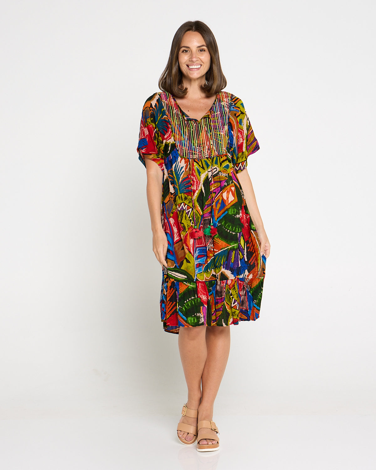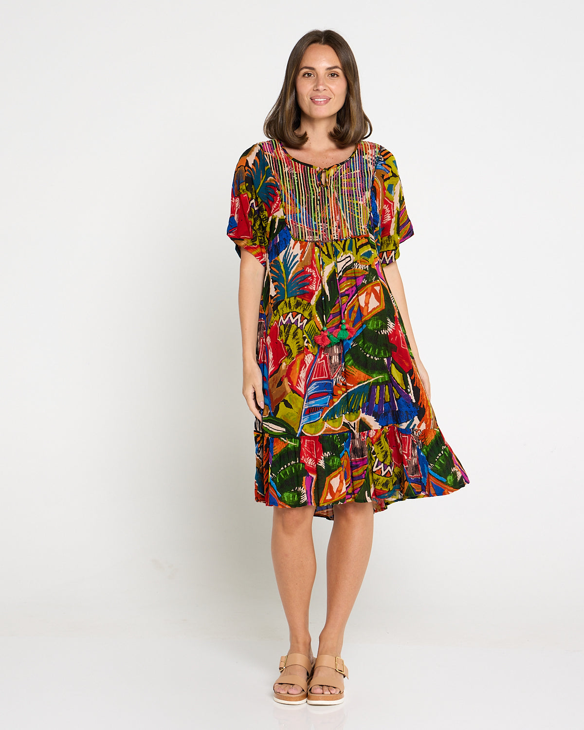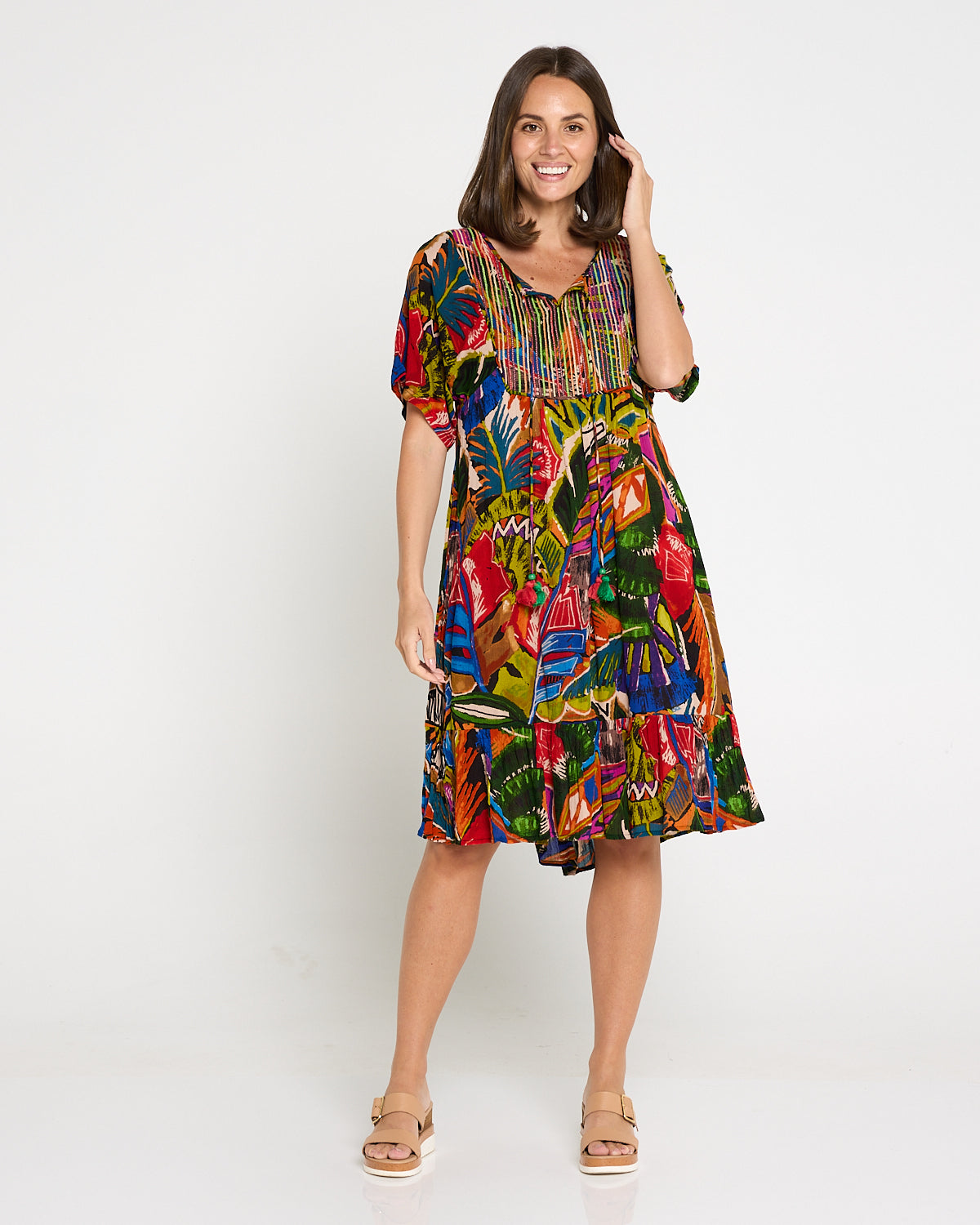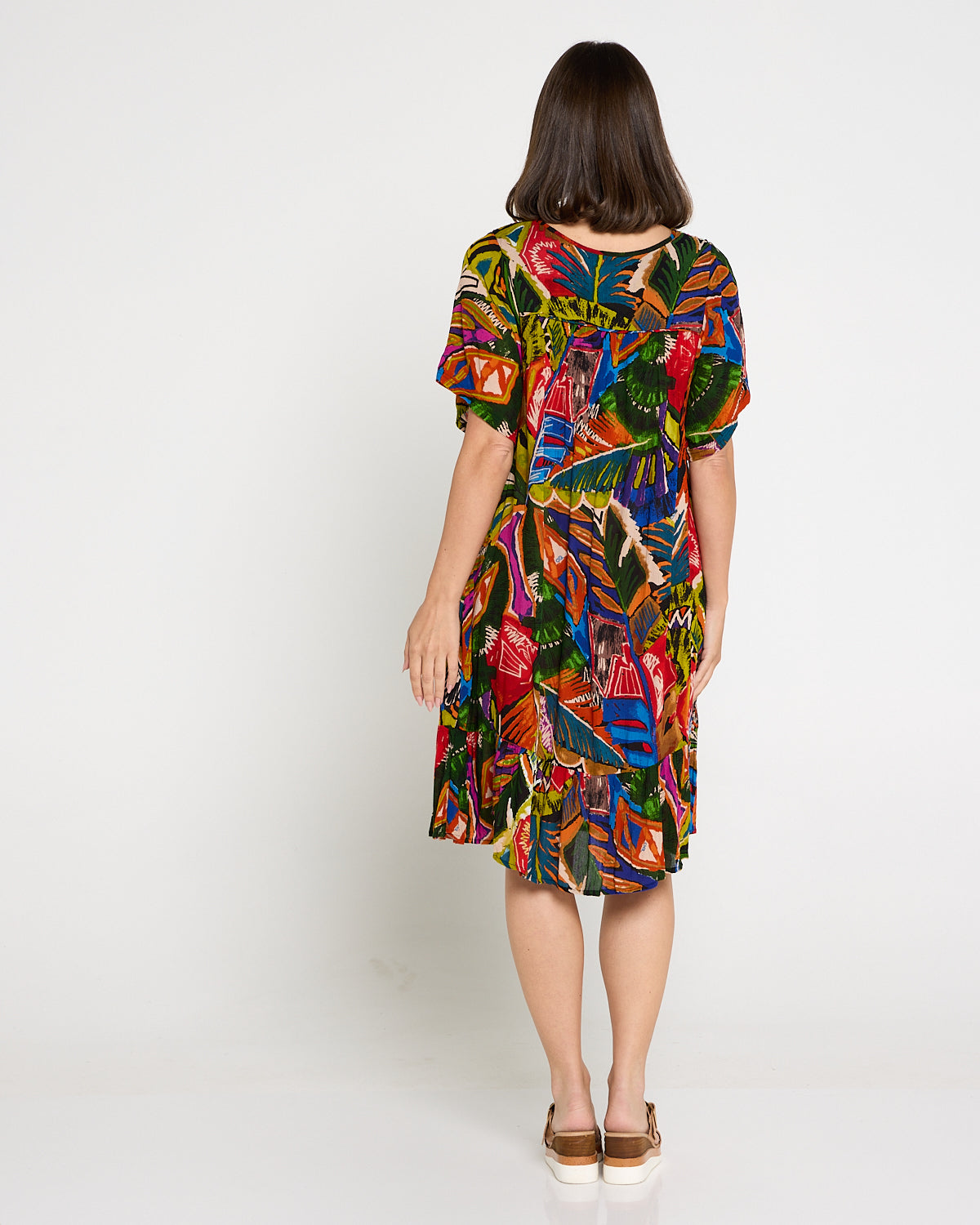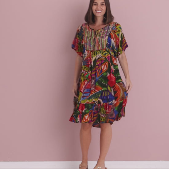 Bring the colour and joy of summer to every outing with the Torgua Dress in Havana Carnival. This vibrant abstract print mixes tropical greens, cobalt, magenta and sunset orange for a joyful, boho look. A softly notched scoop neckline and pintucked bib add polish, while the lightweight pure rayon with a crinkle finish, drapes beautifully without clinging. With practical pockets and an easy midi length, it’s the throw-on style you’ll reach for on warm days—perfect with tan sandals now and a light cardi later.