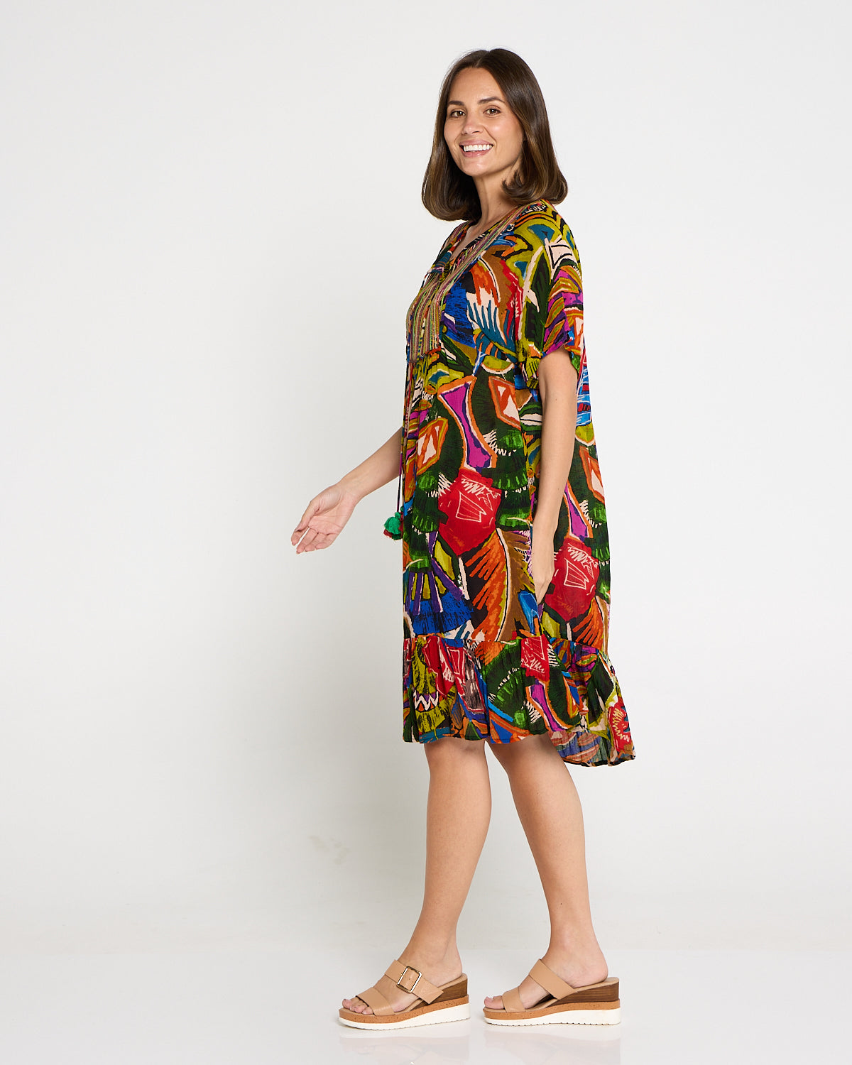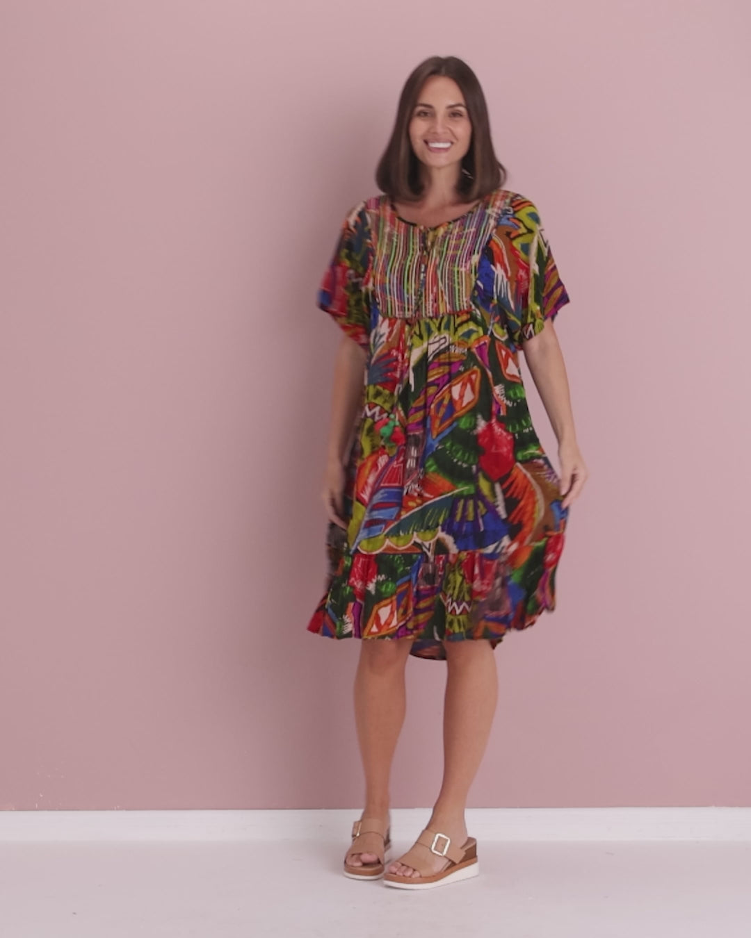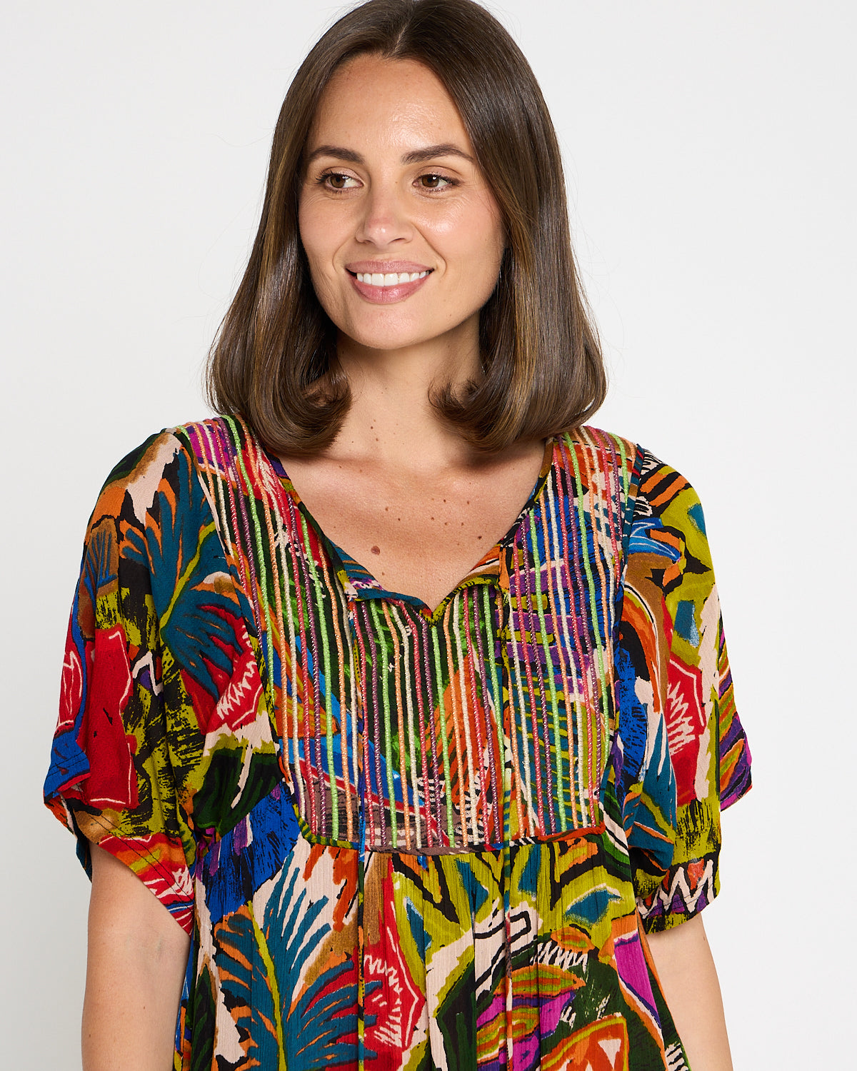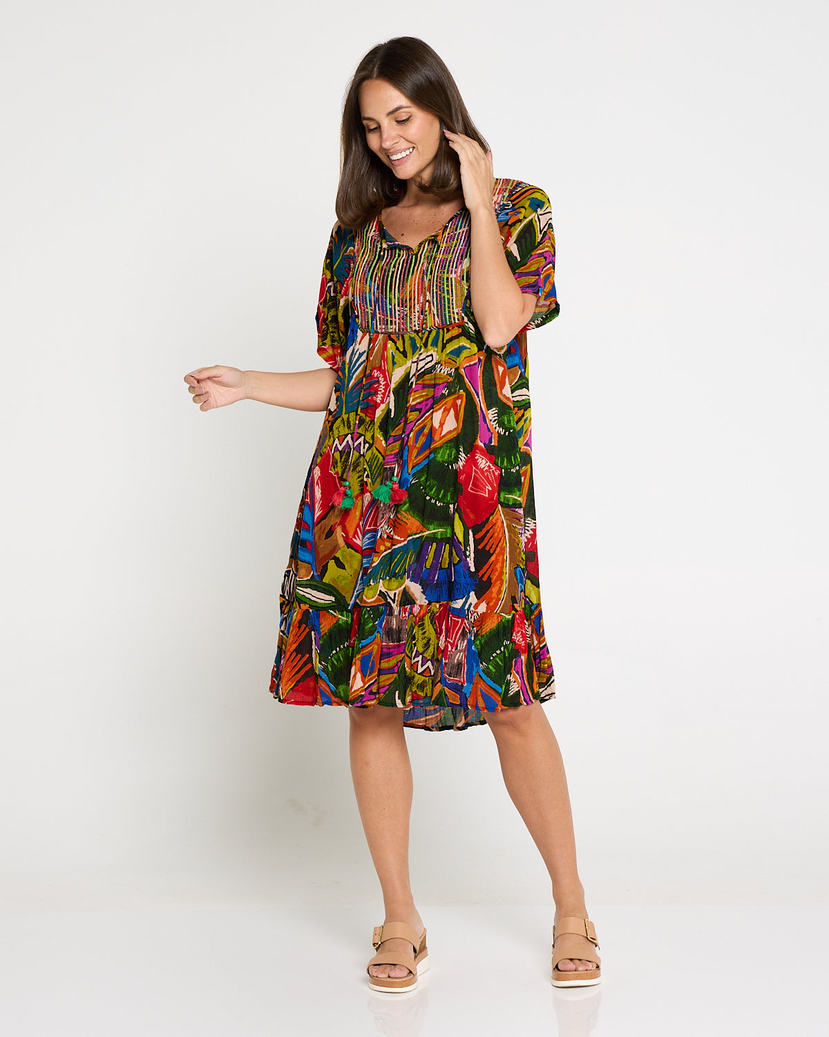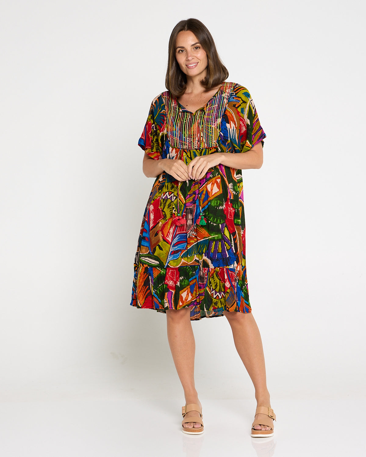 Bring the colour and joy of summer to every outing with the Torgua Dress in Havana Carnival. This vibrant abstract print mixes tropical greens, cobalt, magenta and sunset orange for a joyful, boho look. A softly notched scoop neckline and pintucked bib add polish, while the lightweight pure rayon with a crinkle finish, drapes beautifully without clinging. With practical pockets and an easy midi length, it’s the throw-on style you’ll reach for on warm days—perfect with tan sandals now and a light cardi later.