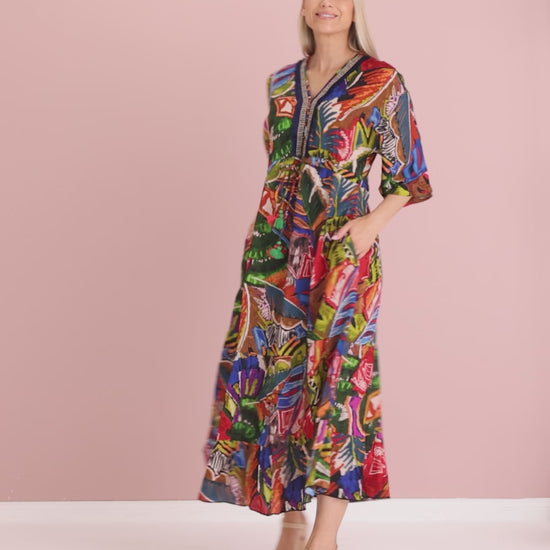 Make every outing feel like a celebration. From Orientique, the Torgua Maxi Dress swirls with vibrant Havana-inspired colour, finished with an embellished split V-neckline that draws the eye upward. Cut from lightweight pure rayon with a subtle satin-like sheen, it floats beautifully without clinging and feels cool on warm days. An adjustable drawstring under the bust creates gentle shape, while the easy drape and handy pockets make it effortless from lunch to weekend getaways. Style with wedges and a raffia clutch, or add gold-tone earrings for evening.