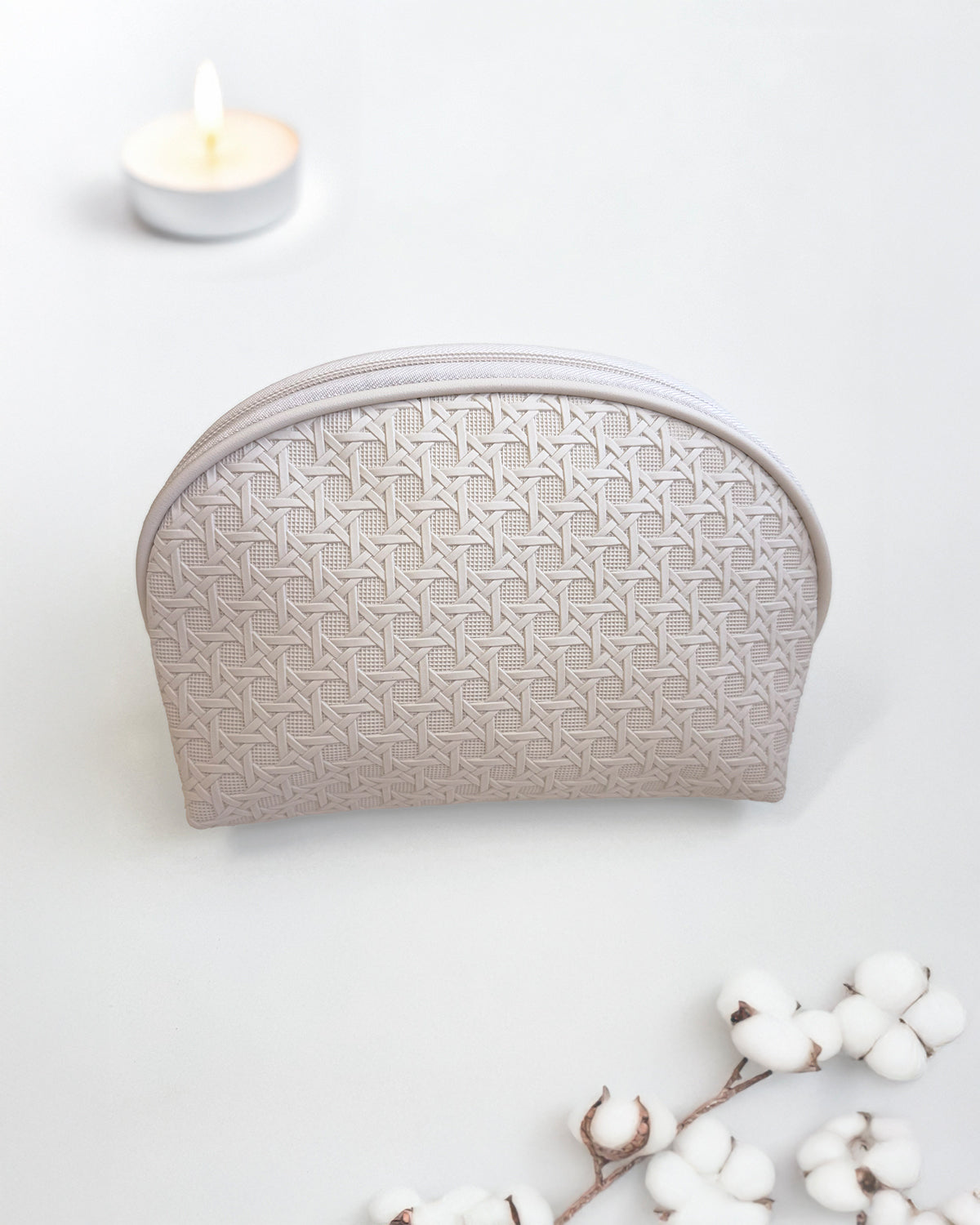 Indulge in luxury with our Tranquility Cosmetic Case in Magnolia Weave. Designed with water-resistant materials and a rubberised outer layer, it offers both style and practicality. The curved zip closure with a gold toned pull adds a touch of elegance, while the faux woven embossed texture exudes sophistication. Perfect for your beauty essentials.