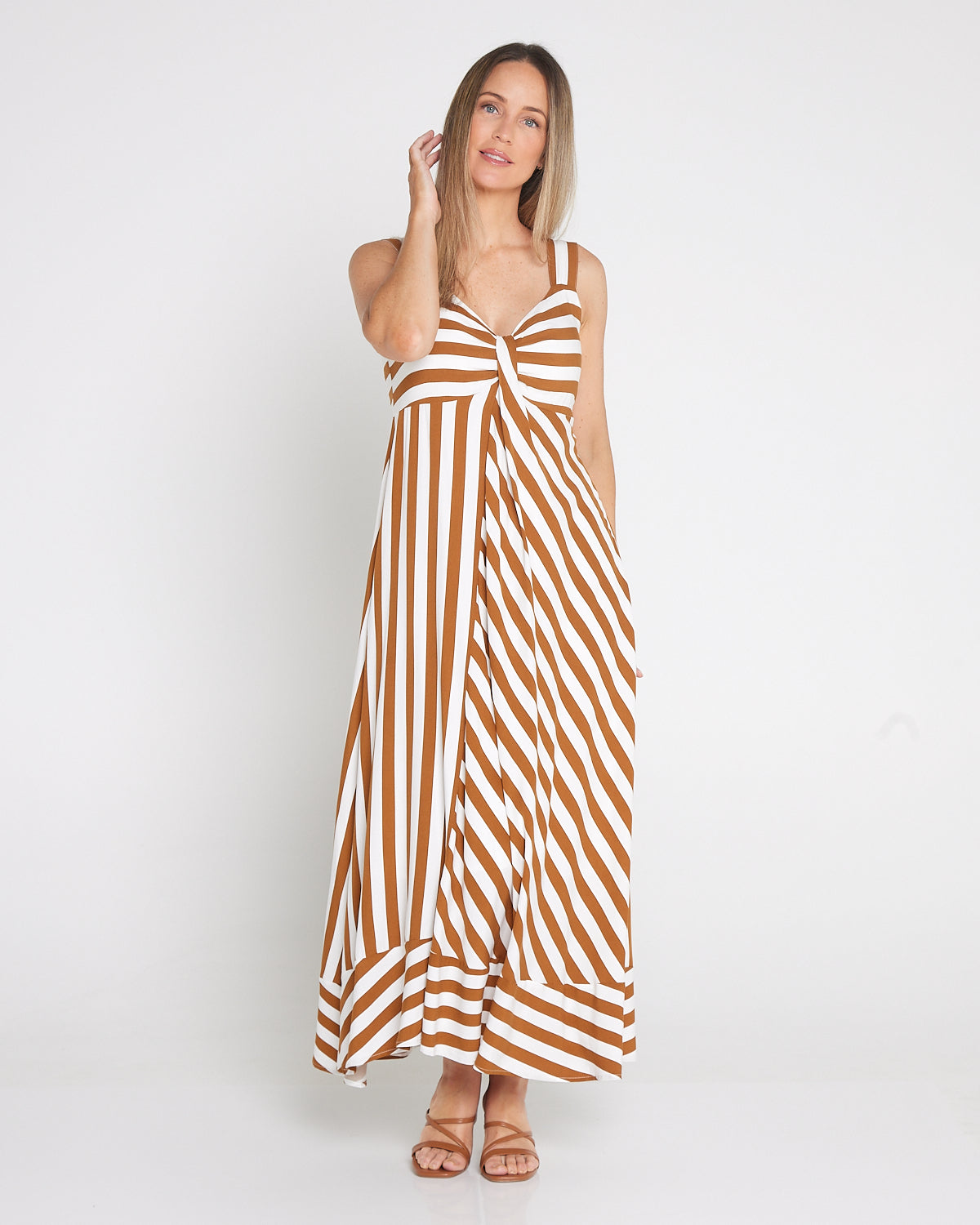 Easy elegance with a graphic twist. The Treville Stripe Dress by eb&ive skims the figure with a soft, floaty fall in caramel-and-white stripes. Cut from lightweight woven rayon, the bodice features a flattering V neckline with a gentle front twist and an under-bust seam that releases into a swishy A-line skirt. Wide straps keep bra-friendly coverage, while the border stripe at the hem finishes the look with polish. Dress up with wedges and a raffia clutch for long lunches, or style casually with slides and a denim jacket for seaside strolls.