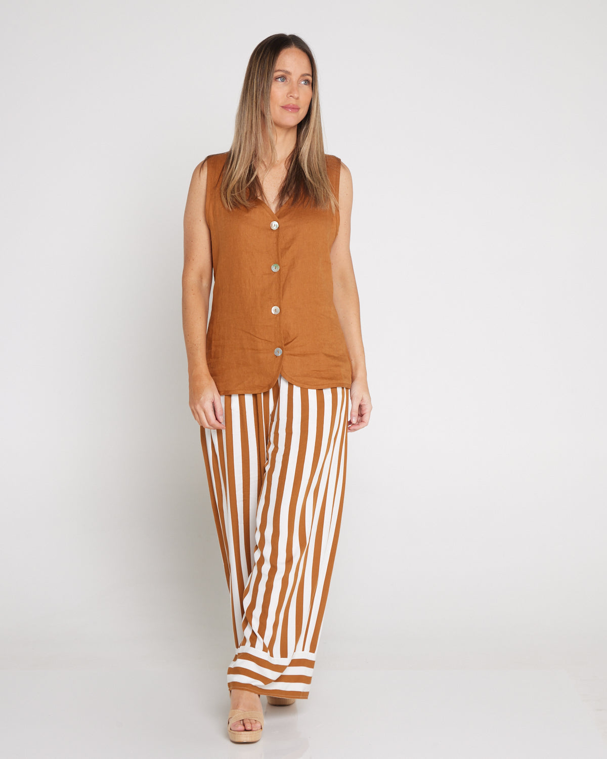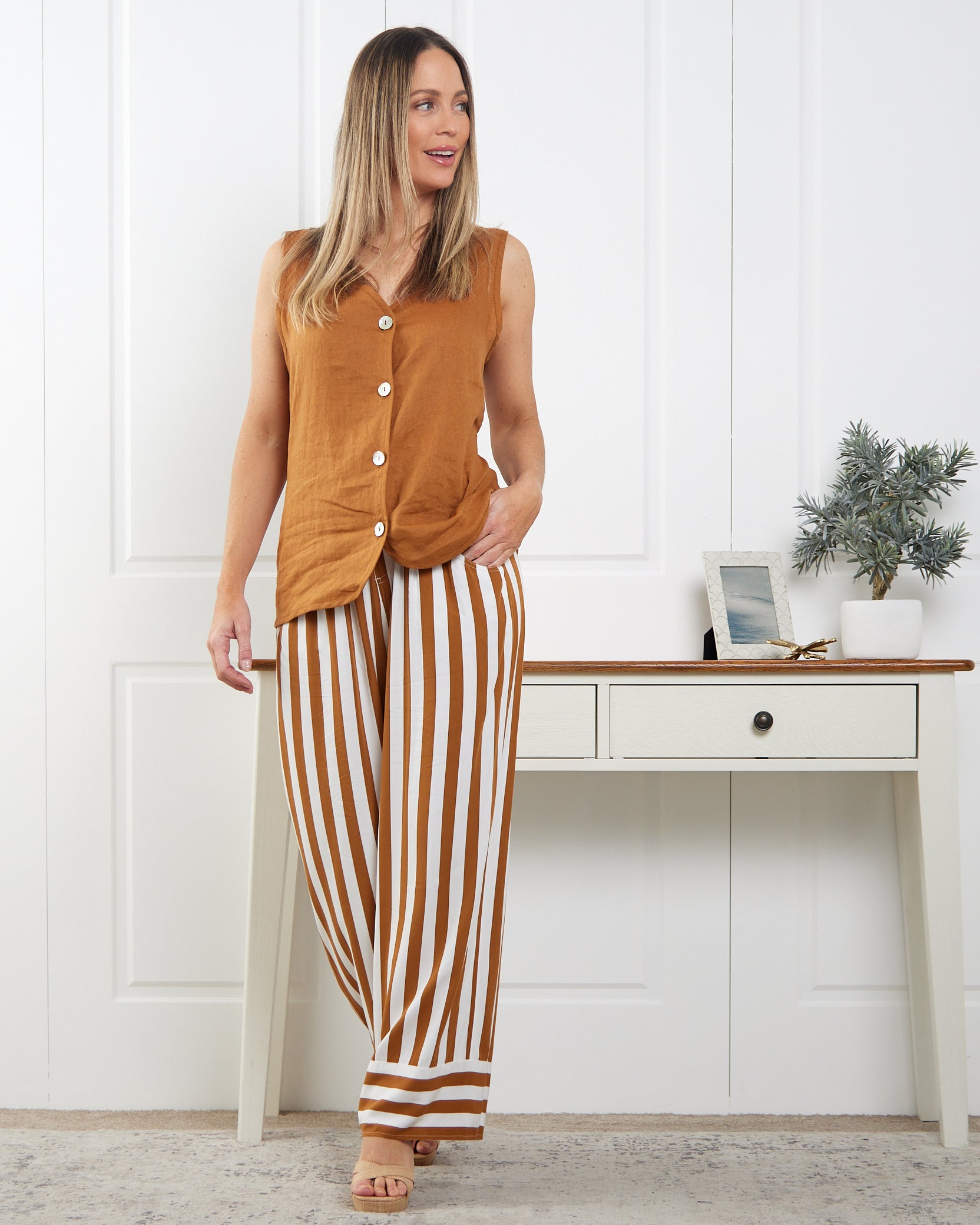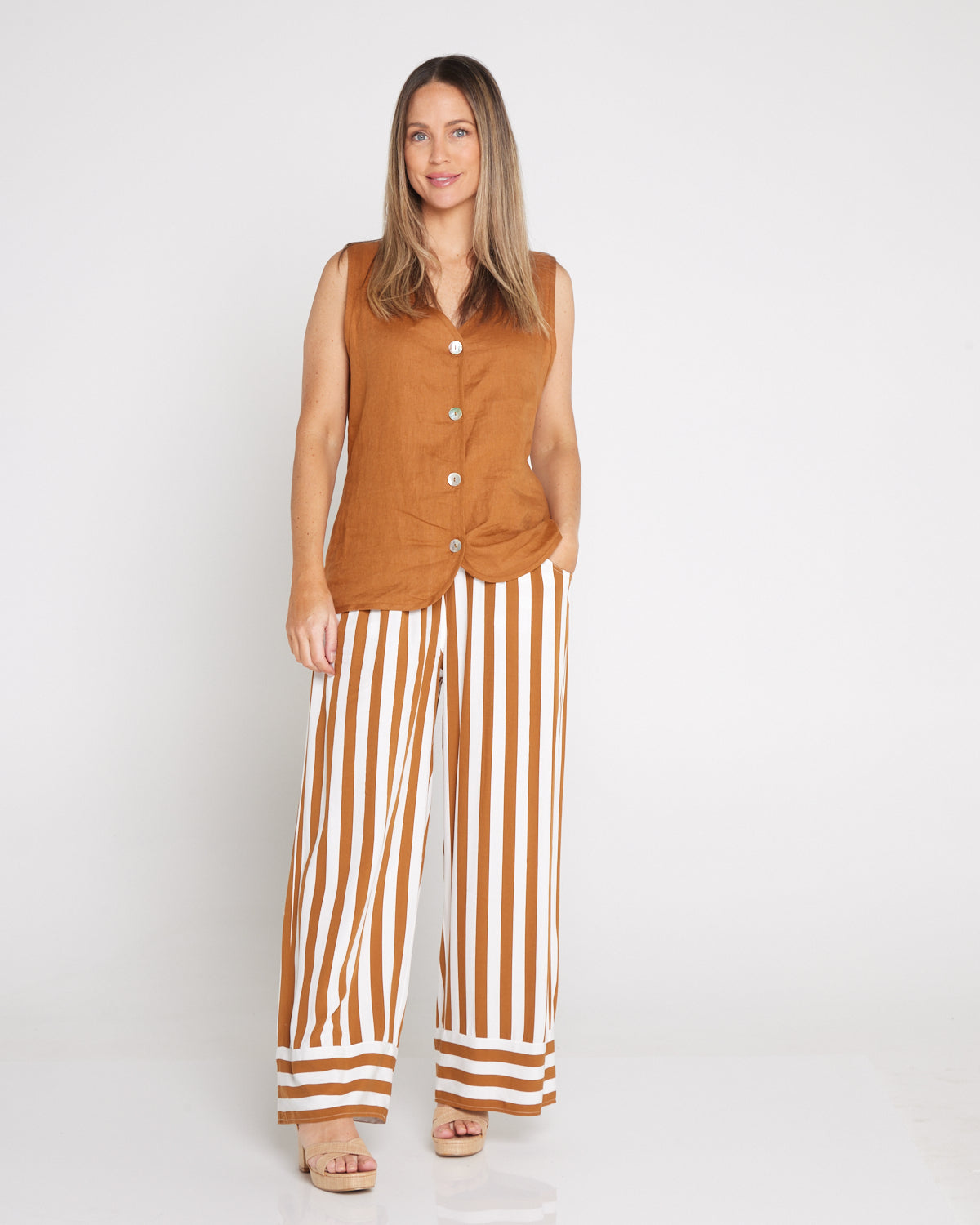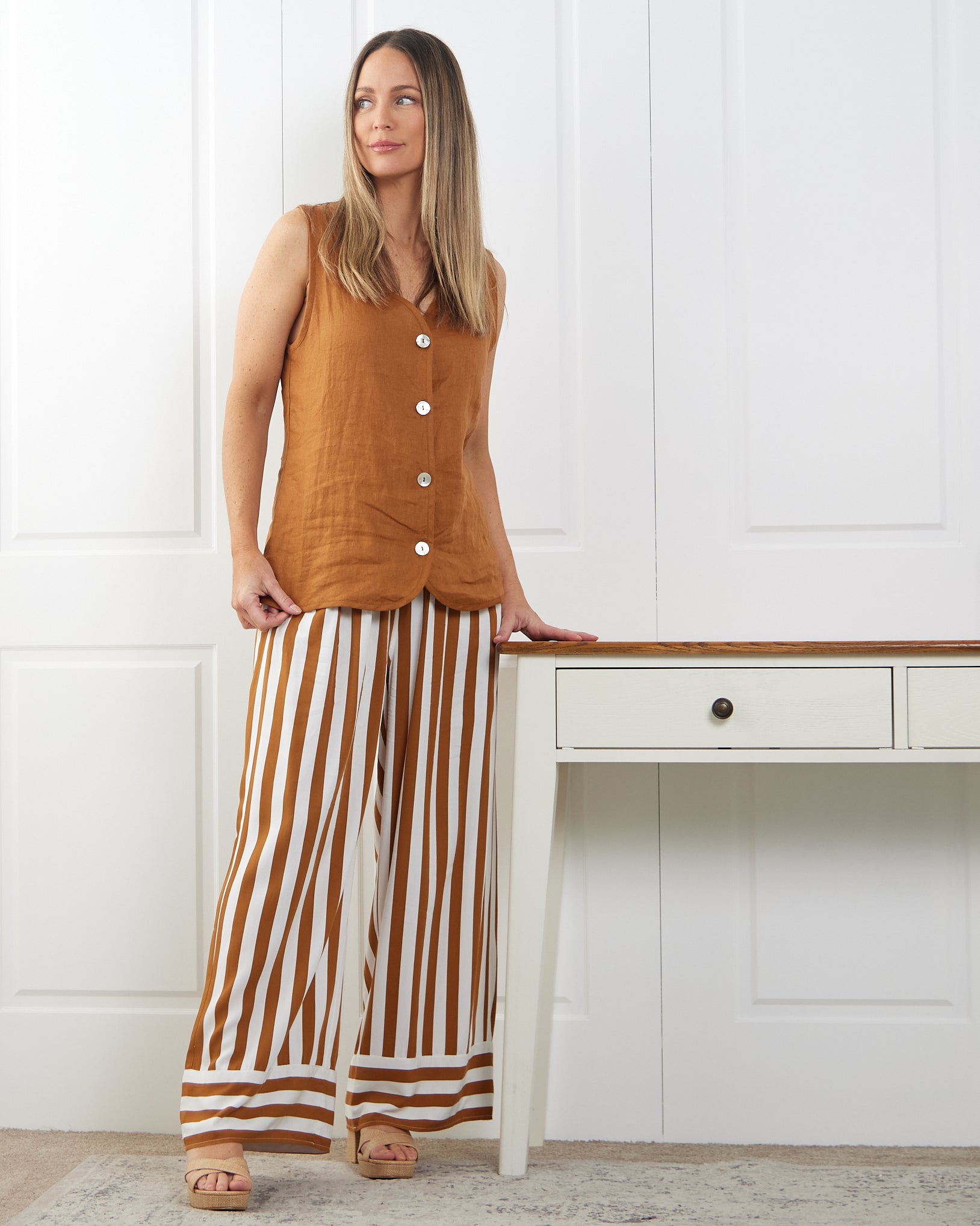 Make a statement the easy way with the Treville Stripe Pant by eb&ive. The caramel-and-white vertical stripes lengthen the leg, while the fluid rayon drapes with a soft, swishy fall. An elasticised pull-on waistband keeps things comfortable through the tummy and hips, and the relaxed wide leg moves beautifully for warm-weather days. Finished with handy pockets and a border stripe at the hem for a polished touch, they’re perfect with a white tee, the matching Treville Stripe Shirt, or a linen tank and slides for brunch to beach.