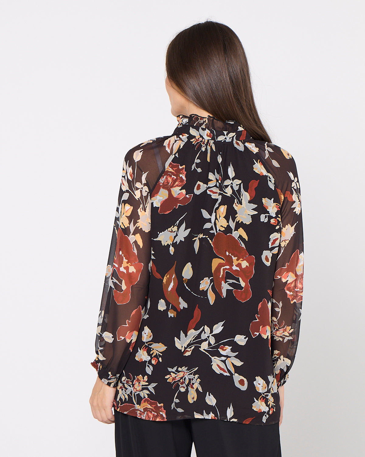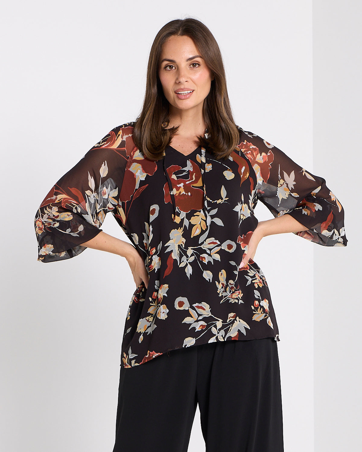 Three-quarter sleeves finish with soft shirring at the cuffs, creating a relaxed blouson shape that sits comfortably on the arm. Light, floaty and easy to style, it pairs beautifully with tailored pants, skirts or denim.