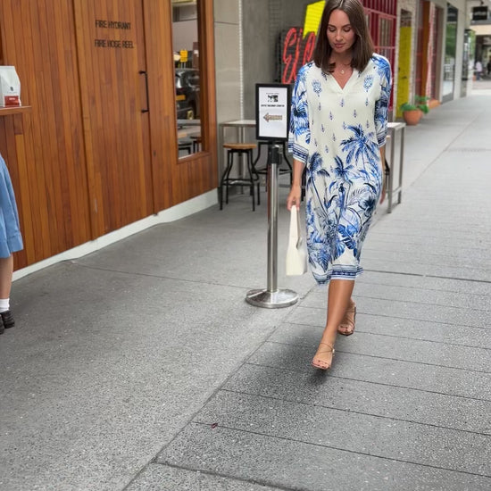 The Whitsundays Dress in White/Delft Blue brings dreamy holiday ease to every day. The soft V-neckline and relaxed, kaftan-inspired cut skim gently over the body, while the elbow-length sleeves and handy pockets keep things practical and comfortable. A blue tropical palm print and border detailing pop against the fresh white base, giving a coastal feel that’s ideal for warm Australian days. The fluid woven rayon drapes beautifully with a soft hanky hem that moves as you walk – just add sandals or wedges for lunches, cruises, resort escapes or relaxed summer gatherings.