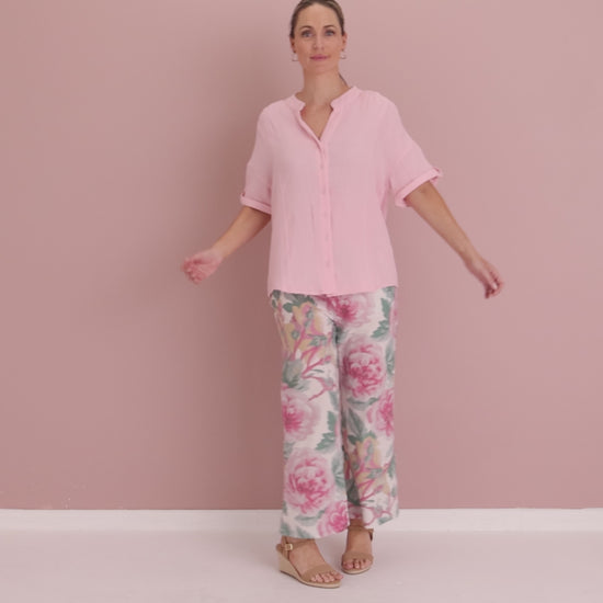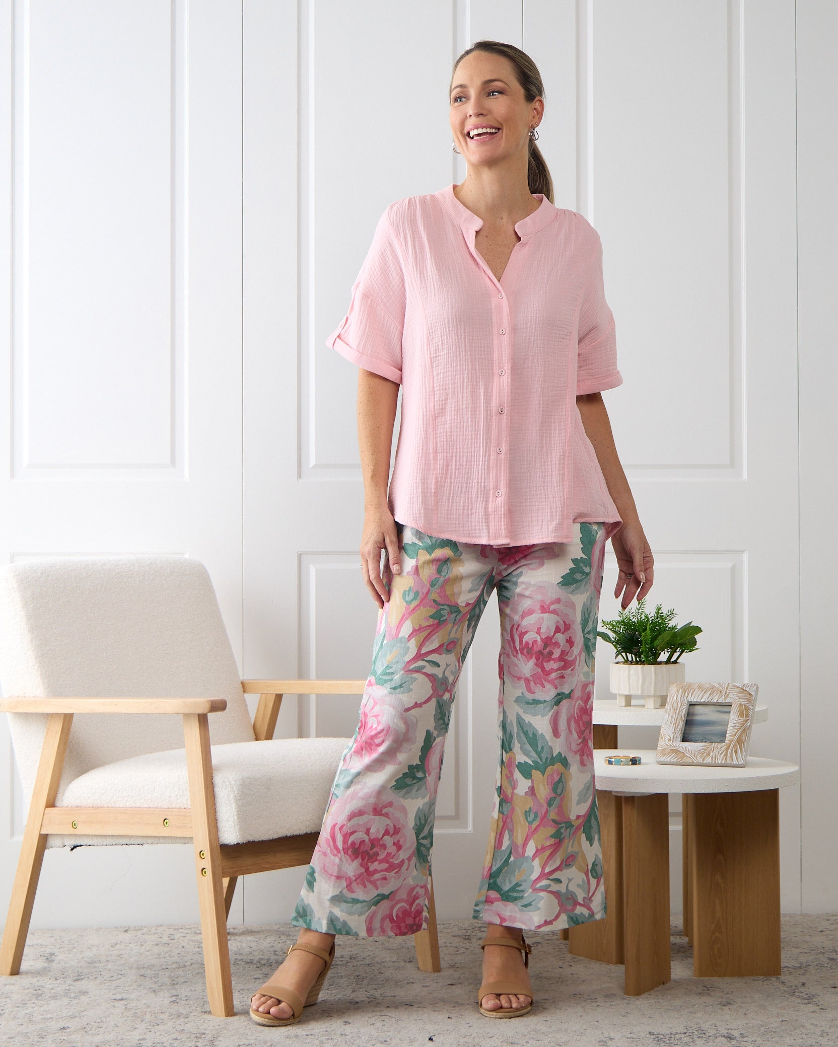 Soft, airy and beautifully understated, the Willow Cotton Gauze Top in Dusty Pink is the effortless everyday piece your warm-weather wardrobe has been waiting for. Crafted from 100% breathable cotton with a softly crinkled gauze texture, it drapes lightly over the body for a cool, relaxed feel. The mandarin-style neckline and button front add gentle structure, while the cuffed short sleeves keep the look polished yet easy. Perfect with linen pants, denim or wide-leg trousers for breezy Australian summer dressing.