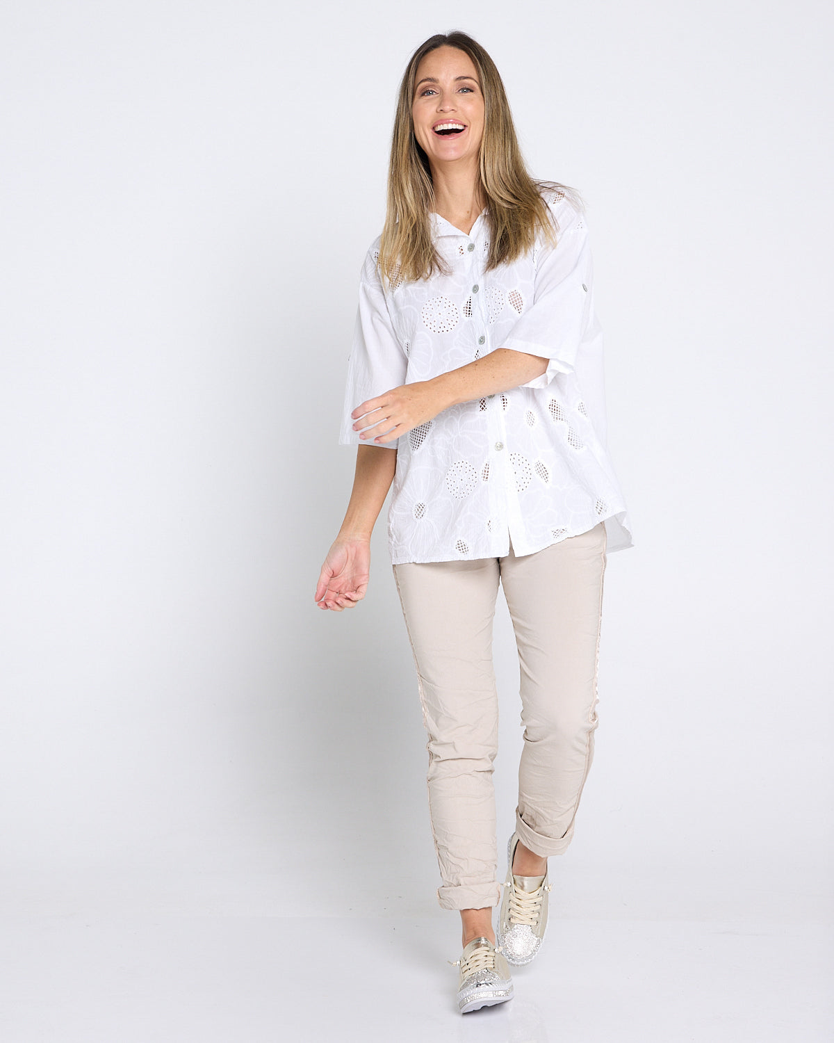 Elevate your wardrobe with the Zadie Stretch Crinkle Pants in Beige, meticulously crafted in Italy. These pants boast a lightweight stretch fabric distinguished by a textured crinkled finish. Featuring an elasticated waistband complemented by wide tape drawstrings, they provide customisable fit and comfort. Practical front and back pockets enhance functionality, while the tapered leg design ensures a streamlined silhouette that adapts effortlessly to movement. Perfectly balancing sophistication and comfort, these pants are suited for versatile, polished wear.