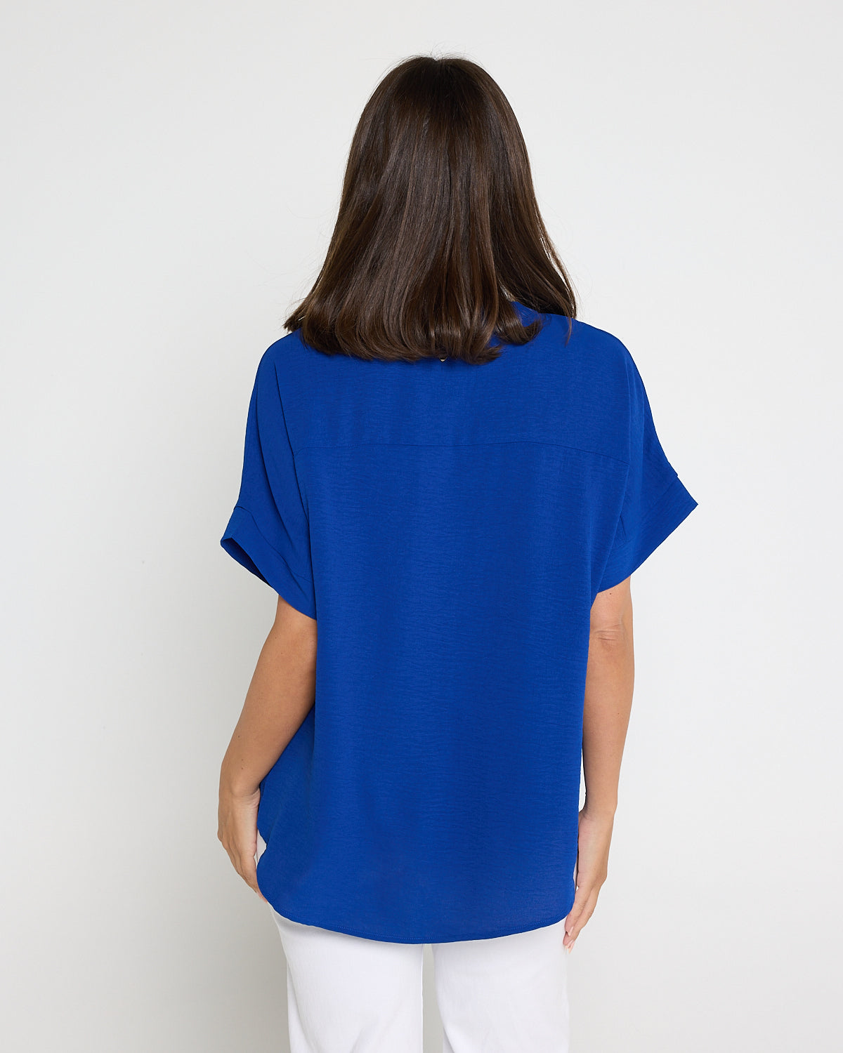 Now in Electric for an instant statement! The Zanita is sister to the Gracie Cotton Muslin Top, but crafted from a faux silk weave for a more elevated look. It features an open grandad collar with a small V-neck, button details over the bust, and extended short sleeves for a relaxed fit. An ideal wardrobe staple that can be dressed up or down with classic looks or current trends. The electric blue shade is always in style, but is especially big for 2026!