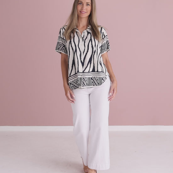 The Zimbabwe Border Shirt in Navy is an effortless way to add bold pattern and relaxed polish to your wardrobe. Crafted from soft, lightweight rayon, it features a striking border print in navy and ivory that instantly elevates simple separates. The collared neckline and button-down front offer a refined touch, while the loose silhouette and curved hem keep it comfortable and flattering. Style it with white jeans for fresh summer appeal or with tailored pants for easy smart-casual dressing.