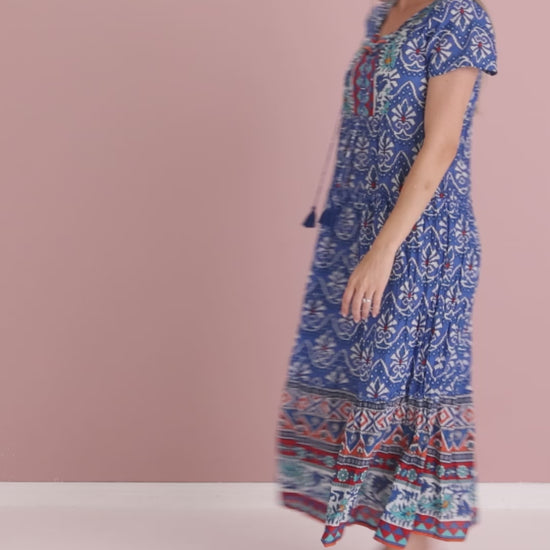 Make a breezy statement with the Zola V Neck Dress in the Gujrat Border print. Embrace effortless elegance with this pure cotton maxi dress, designed to keep you cool and comfortable through warm weather. The tiered skirt creates beautiful, flowing movement with every step, while the V-neckline and tassel ties offer a charming, versatile touch. Short sleeves and a relaxed silhouette make it perfect for holidays, casual dining, or seaside walks—a dress that works as hard as you do, whether you're dressing up or keeping it simple.